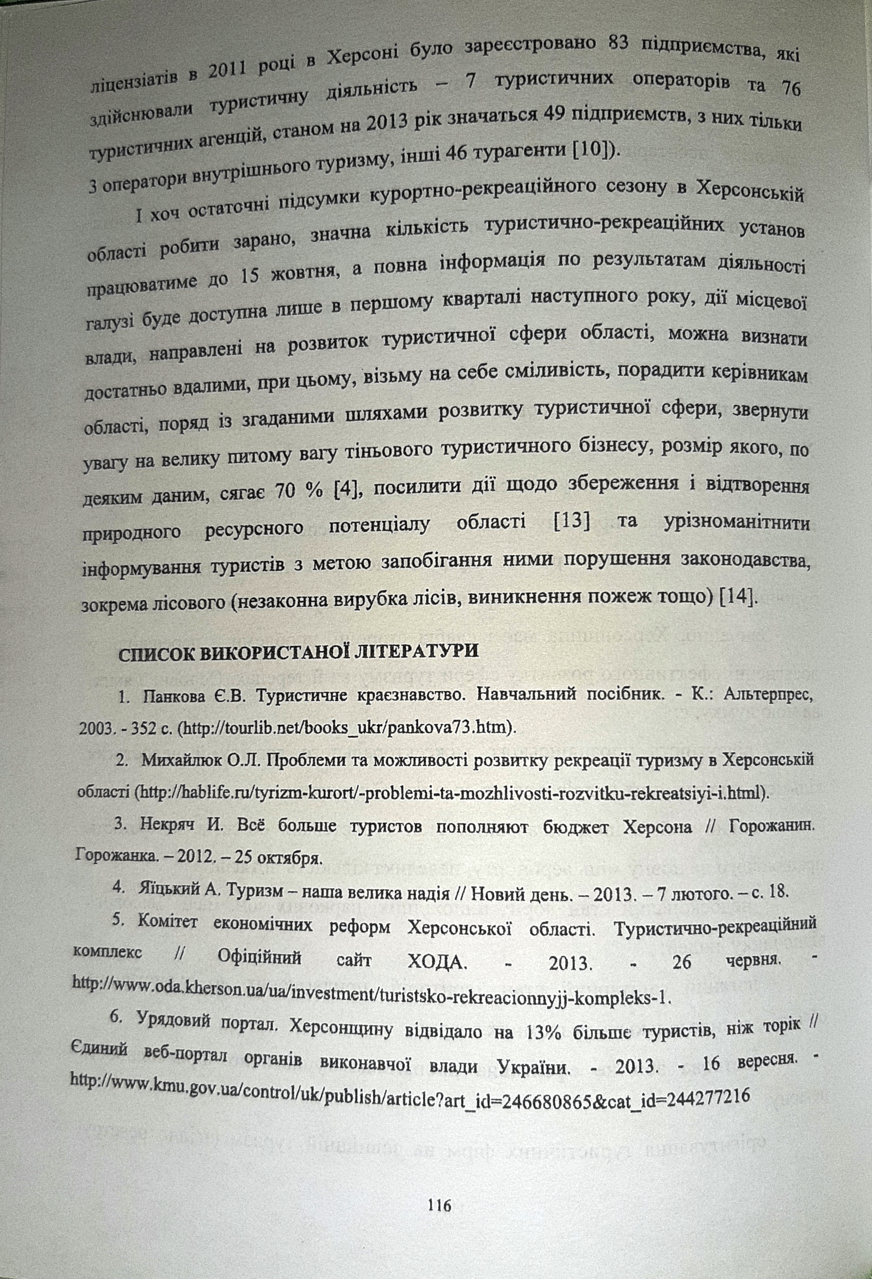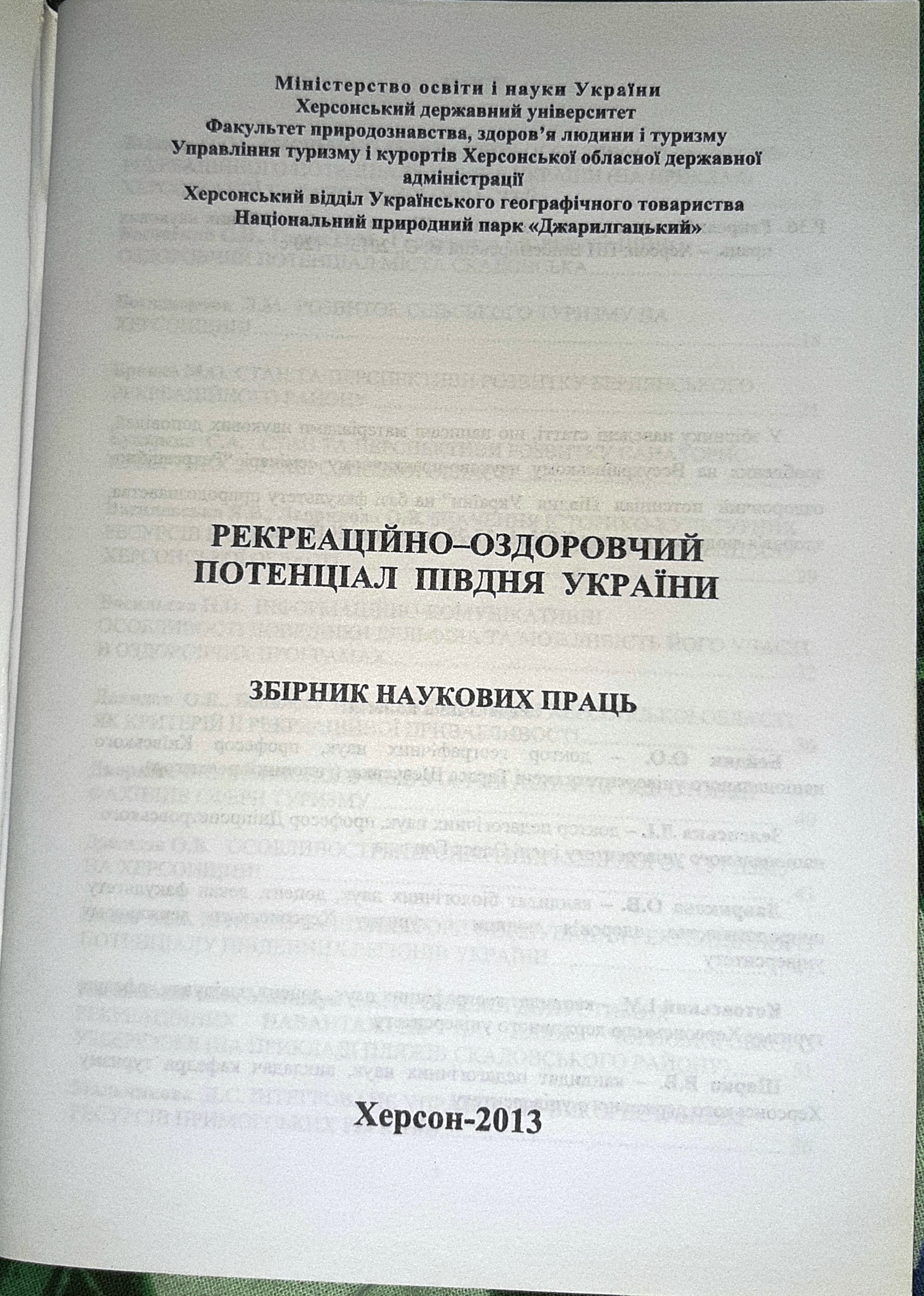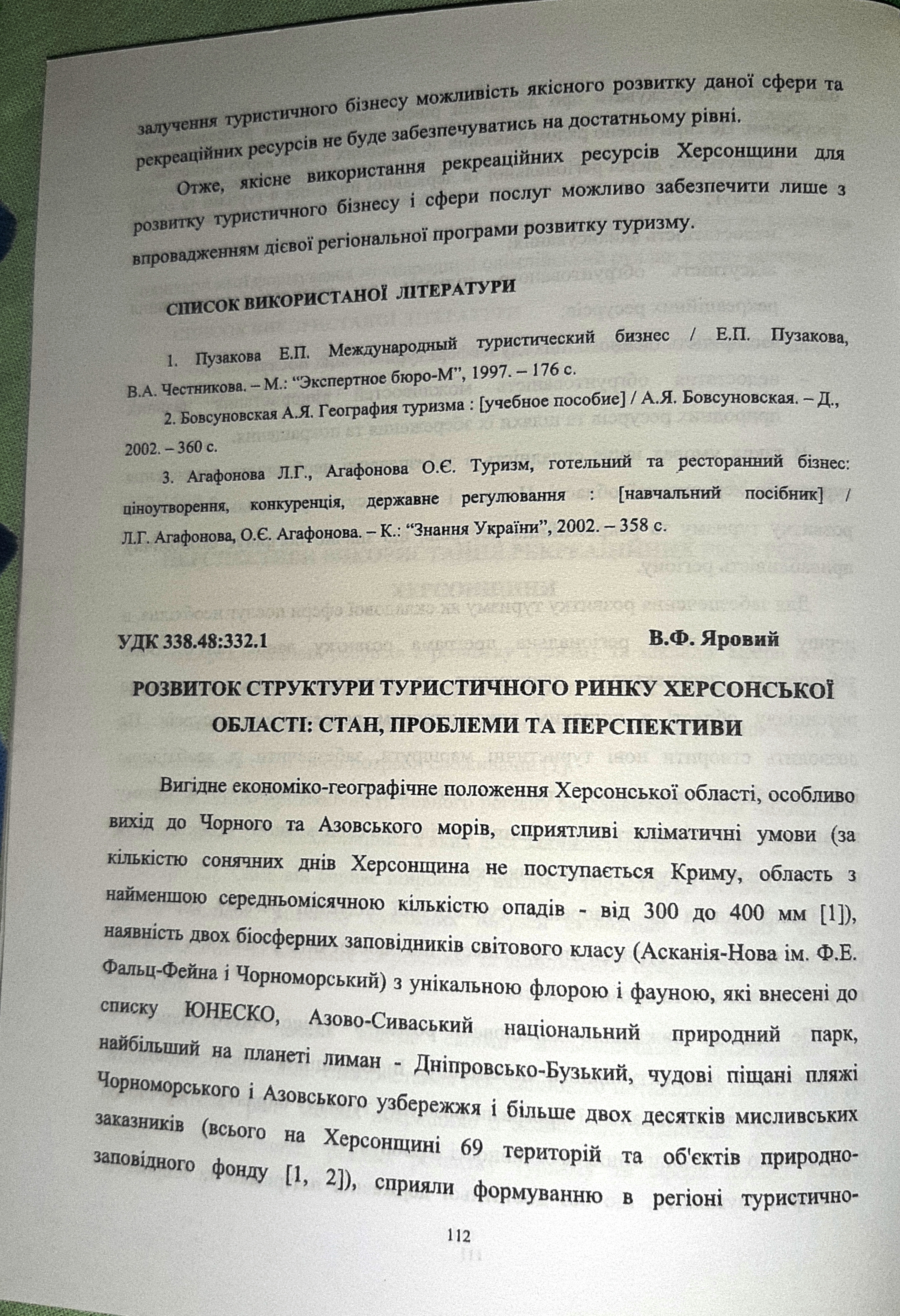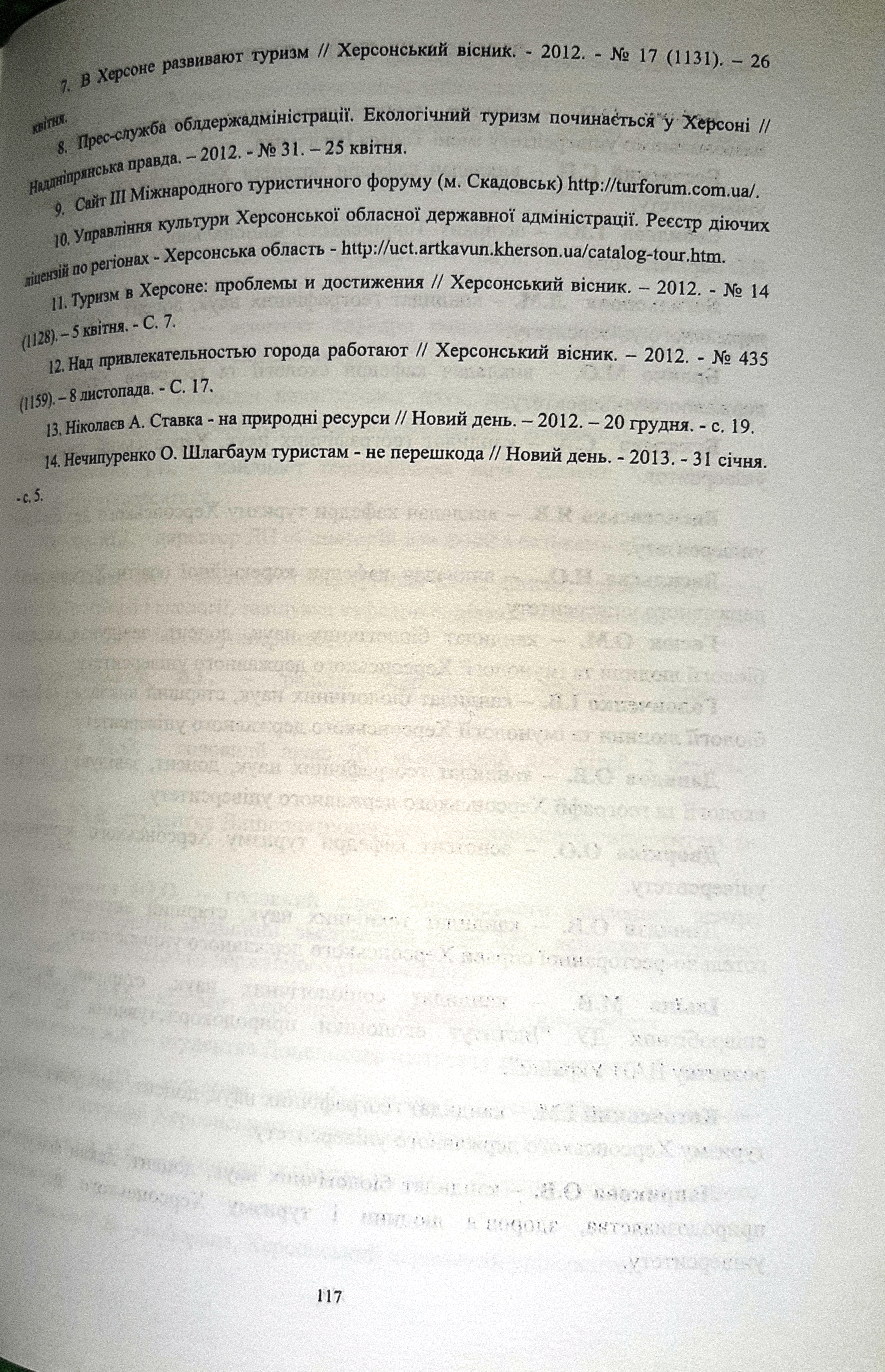 Яровий, В. Ф. Розвиток структури туристичного ринку Херсонської області : стан, проблеми та перспективи / В. Ф. Яровий // Рекреаційно-оздоровчий потенціал Півдня України : зб. наук. праць. Всеукр. наук.-практ. семінару (м. Херсон, 27-28 листопада 2013 р.) / Херсон : ПП Вишемирський. – 2016. – С. 112-117.
