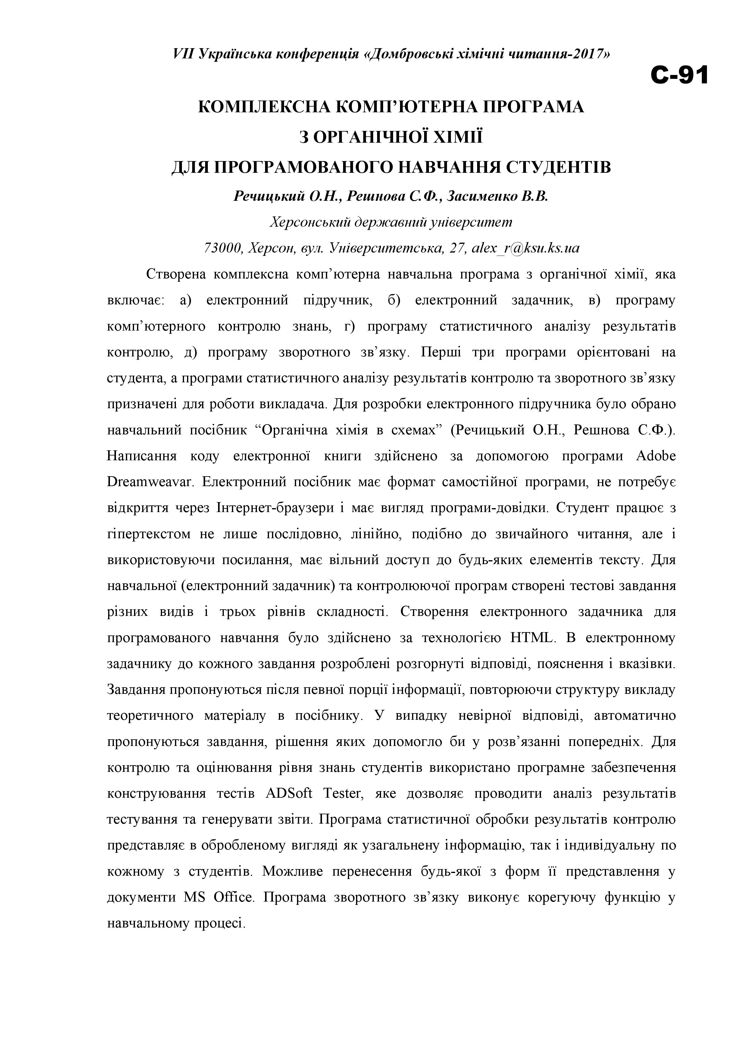 Речицький, О. Н. Комплексна комп’ютерна програма з органічної хімії для програмованого навчання студентів [Текст] / О. Н. Речицький, С. Ф. Решнова, В. В. Засименко // Матеріали VІ Всеукраїнської конференції “Домброські читання – 2017” (м. Яремча,12-16 вересня 2017 р.) / Івано-Франківський національний медичний університет. - Івано-Франківськ : Івано-Франківський національний медичний університет, 2017. – С. 131.