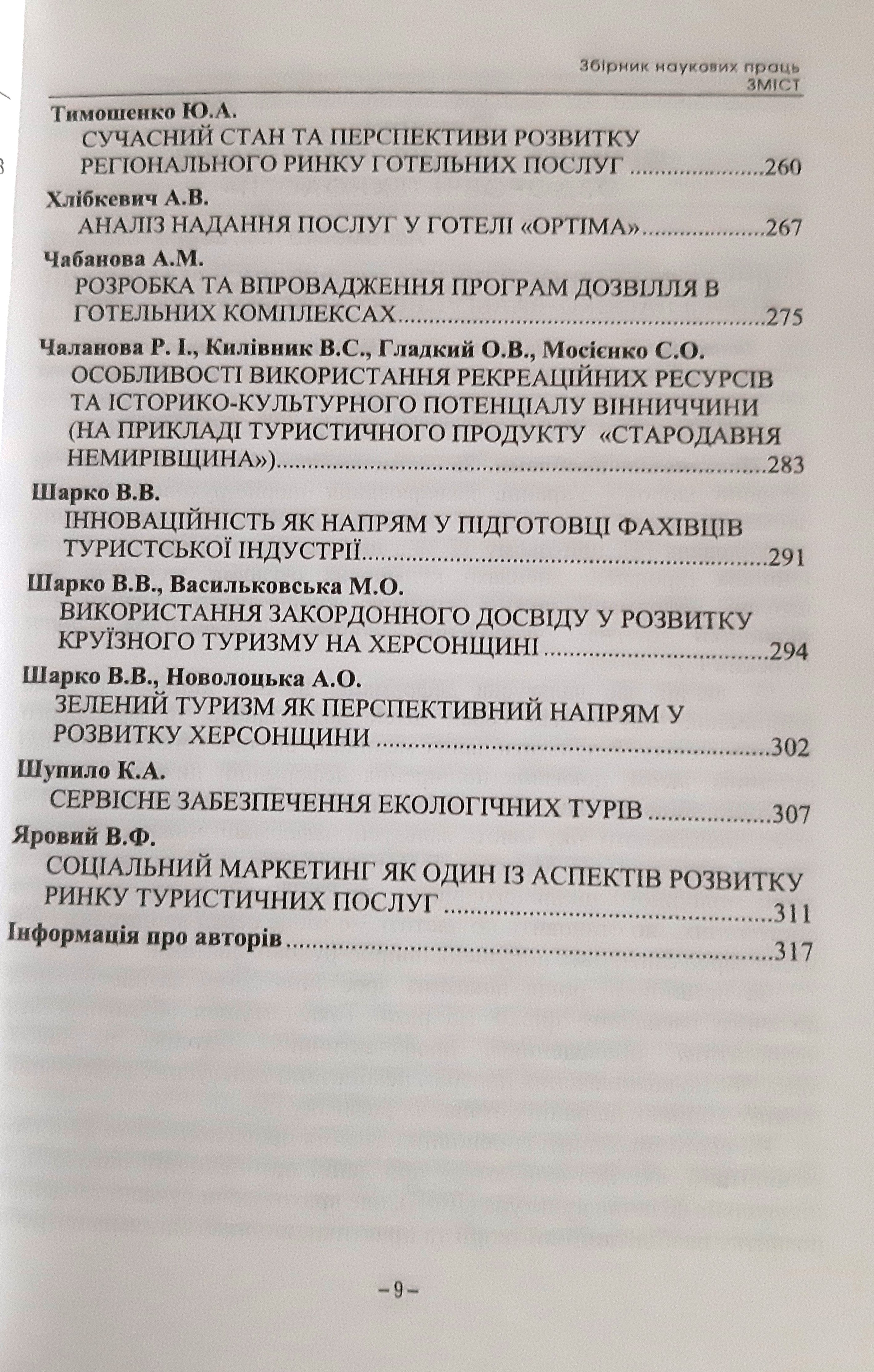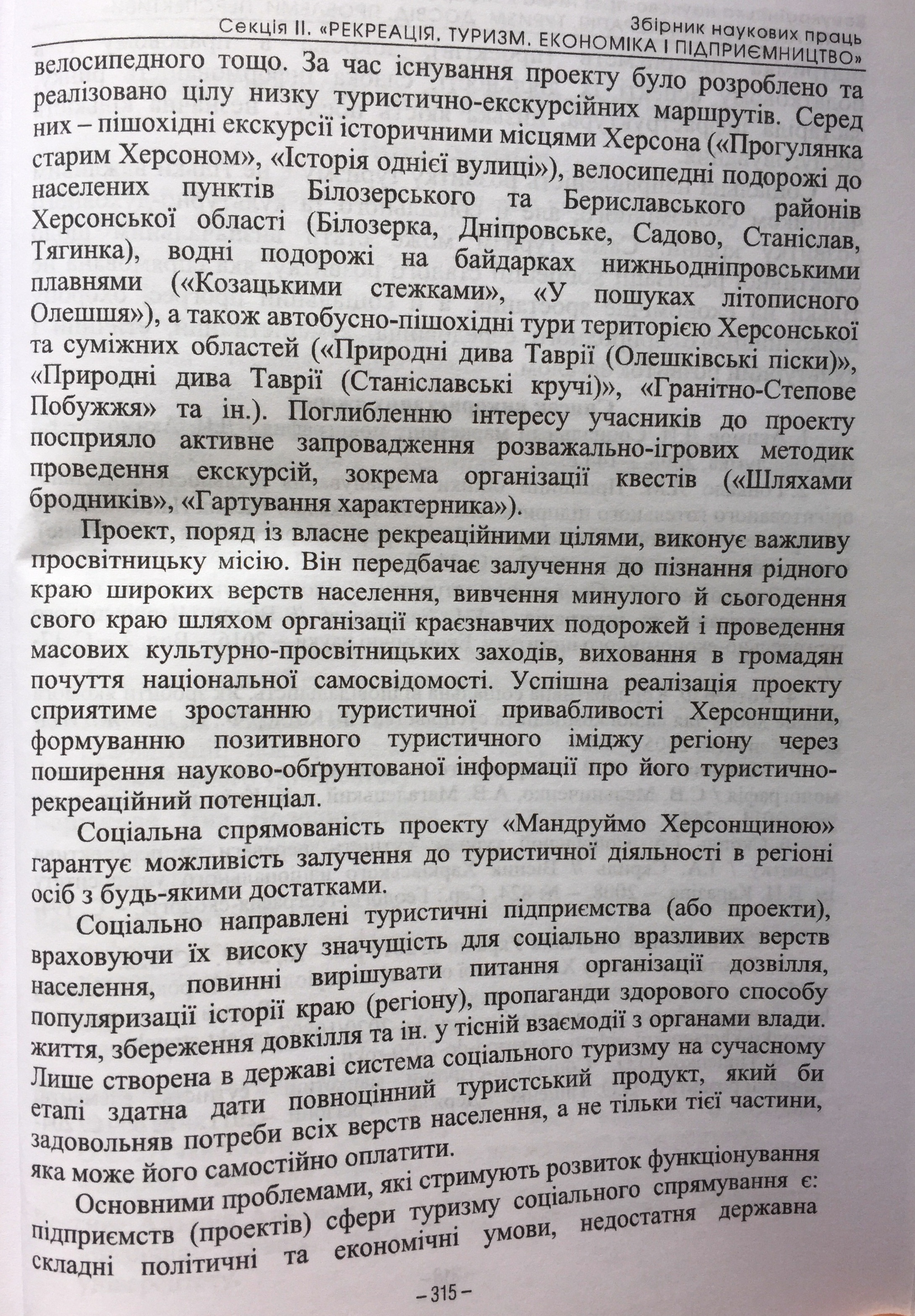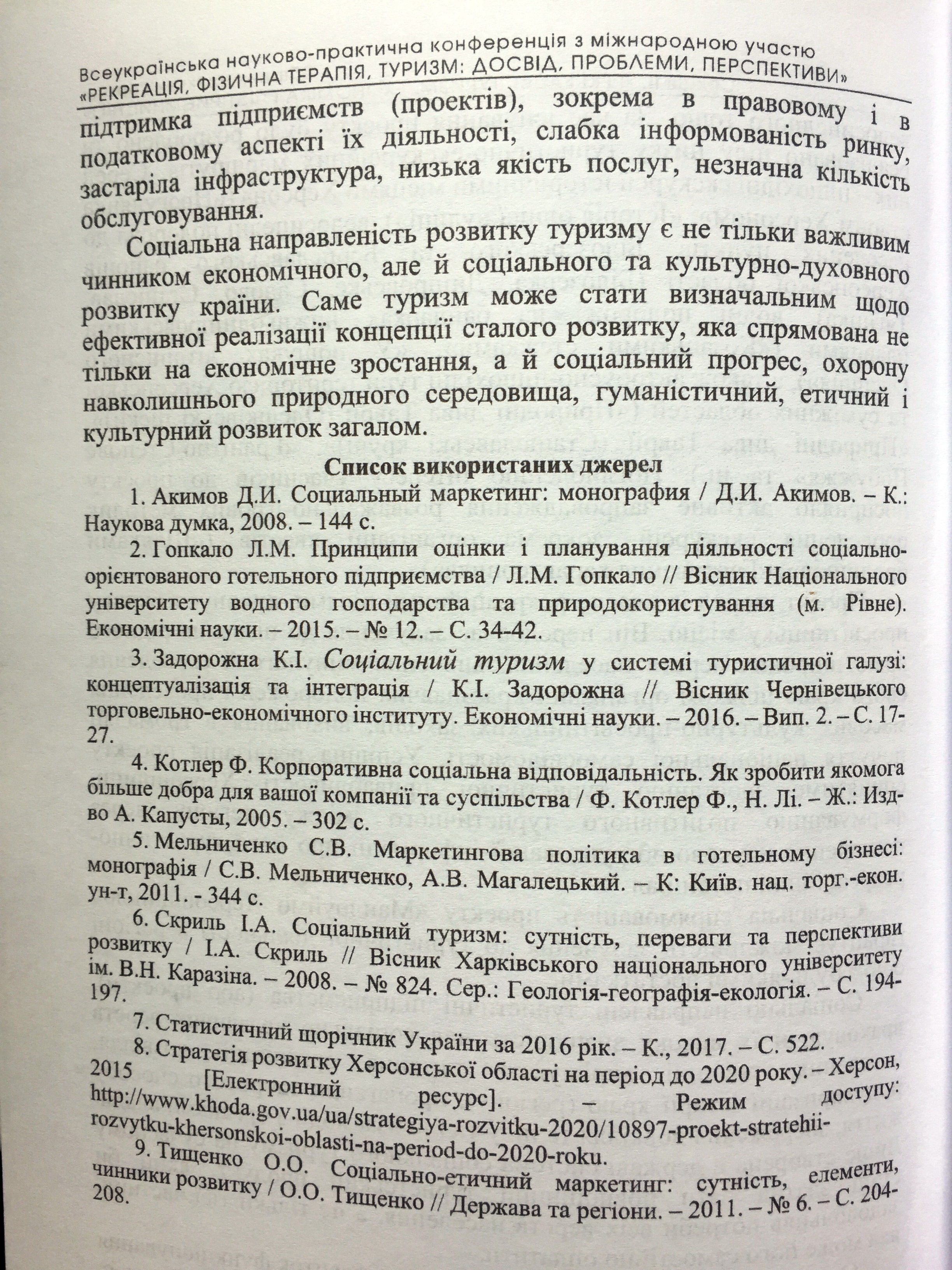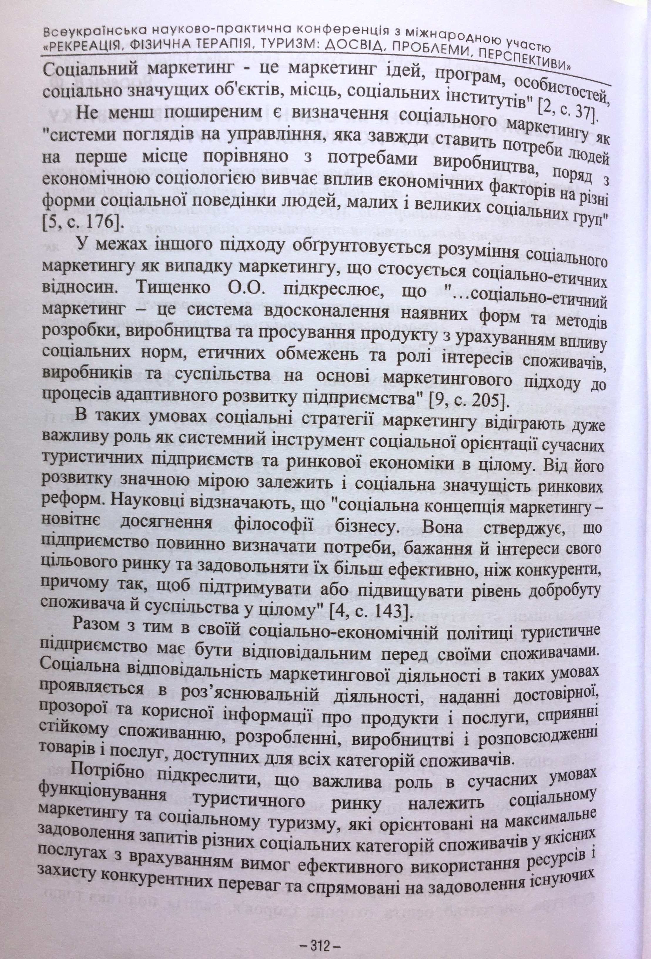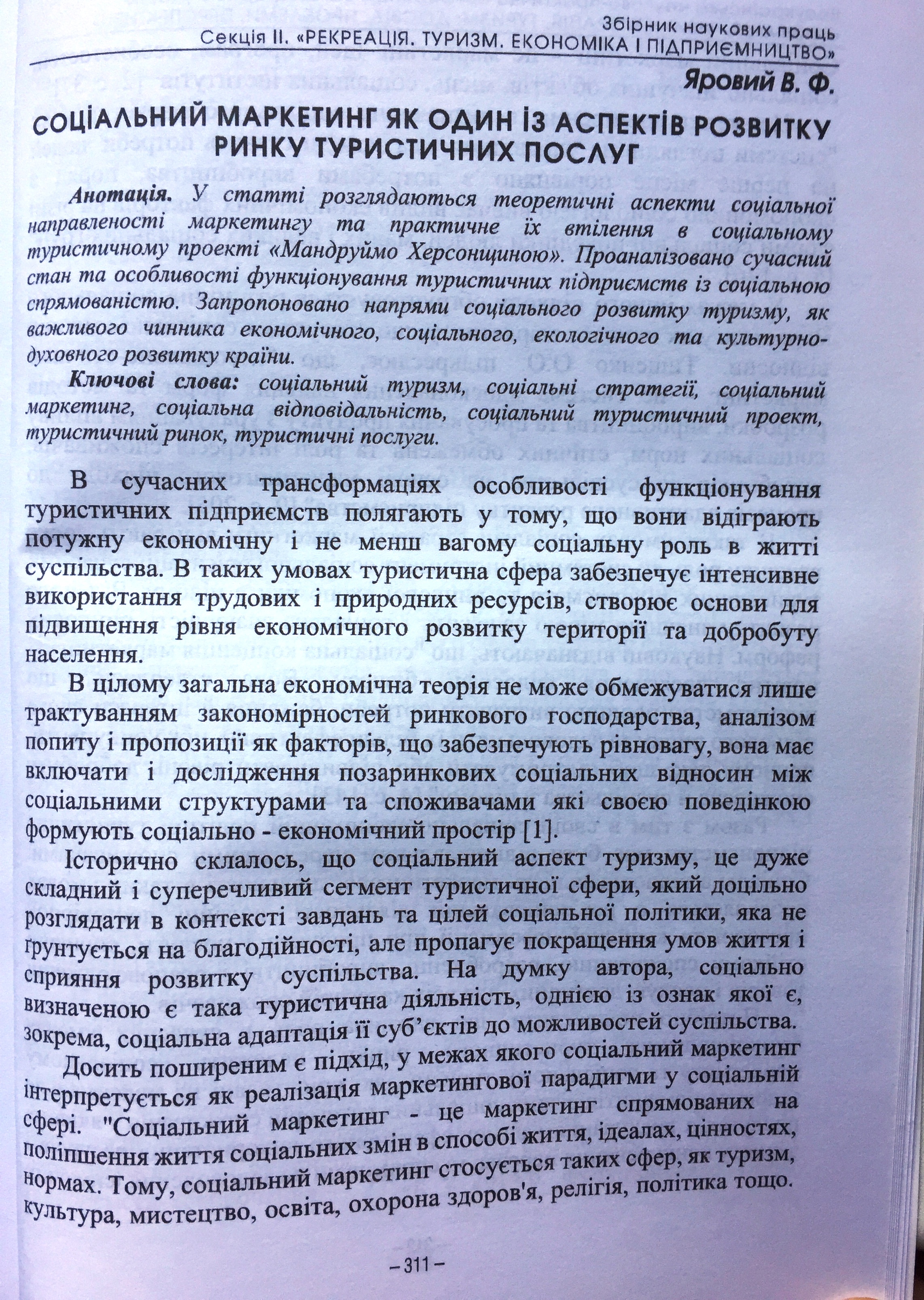 Яровий, В. Ф. Соціальний маркетинг як один із аспектів розвитку ринку туристичних послуг / В. Ф. Яровий // Всеукр. наук.-практ. конференція з міжнар. участю «Рекреація, фізична терапія, туризм : досвід, проблеми, перспективи» : зб. матер. (м. Херсон, 17-18 травня 2018 р.). – Херсон : ПП Вишемирський. – 2018. – С. 311-316.