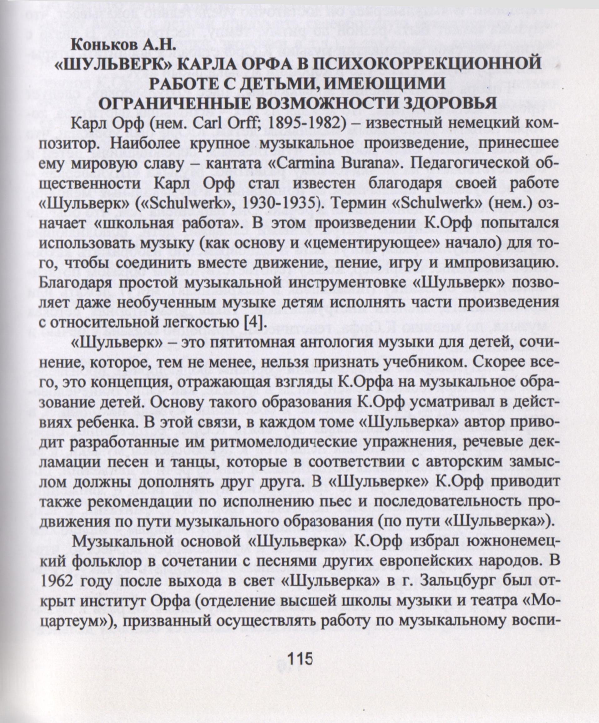 Коньков, А. Н. "Шульверк" Карла Орфа в психокоррекционной работе с детьми, имеющими ограниченные возможности здоровья / А. Н. Коньков // Психологічний тренінг у мистецтві, культурі, освіті : зб. наук. праць Всеукр. наук.-практ. конф. / Міністерство освіти і науки України ; Херсонський держ. ун-т ; Факультет культури і мистецтв ; Кафедра психології та педагогіки мистецької освіти. - К. ; Херсон : Просвіта, 2010. - С. 115-122.