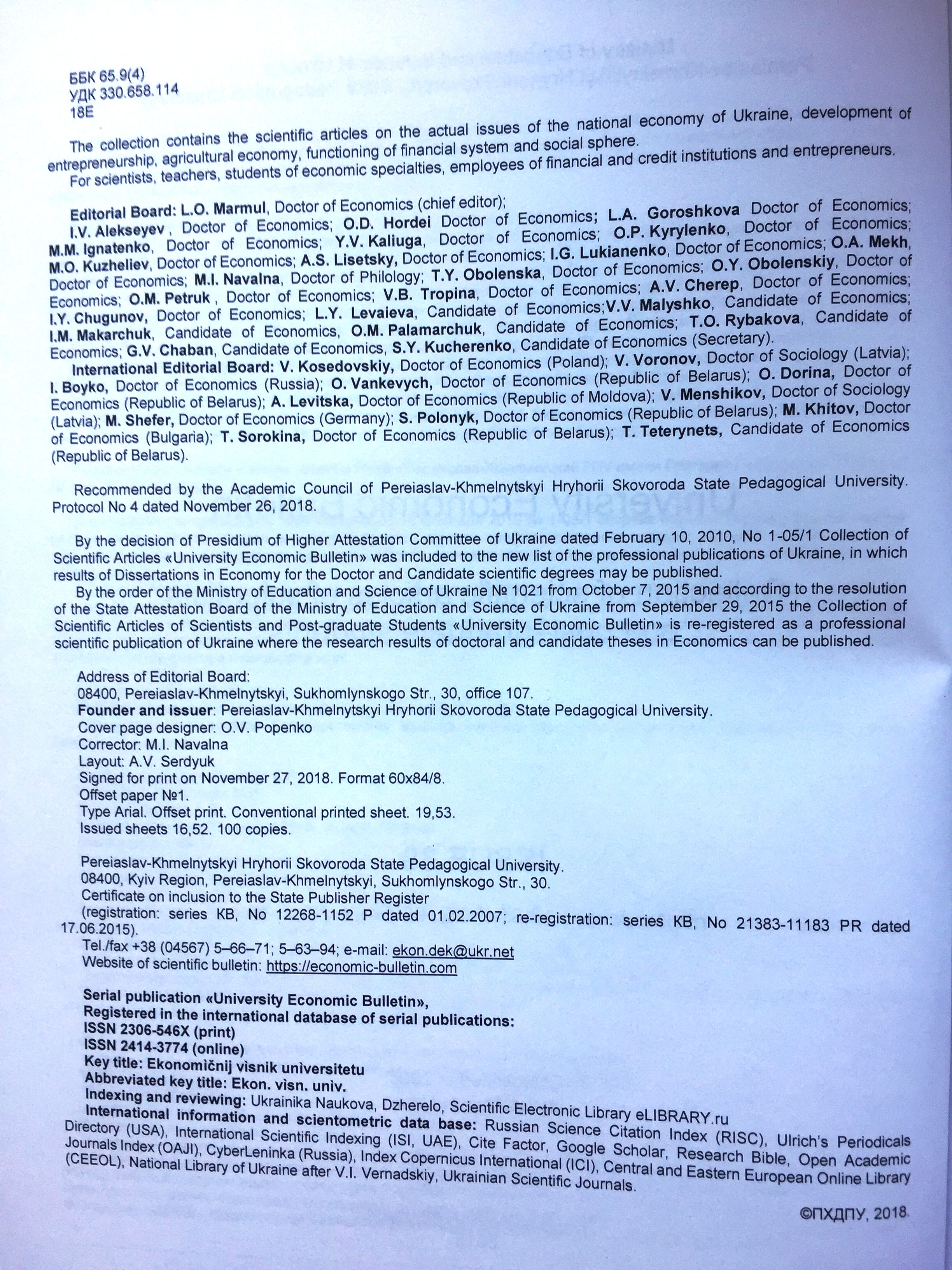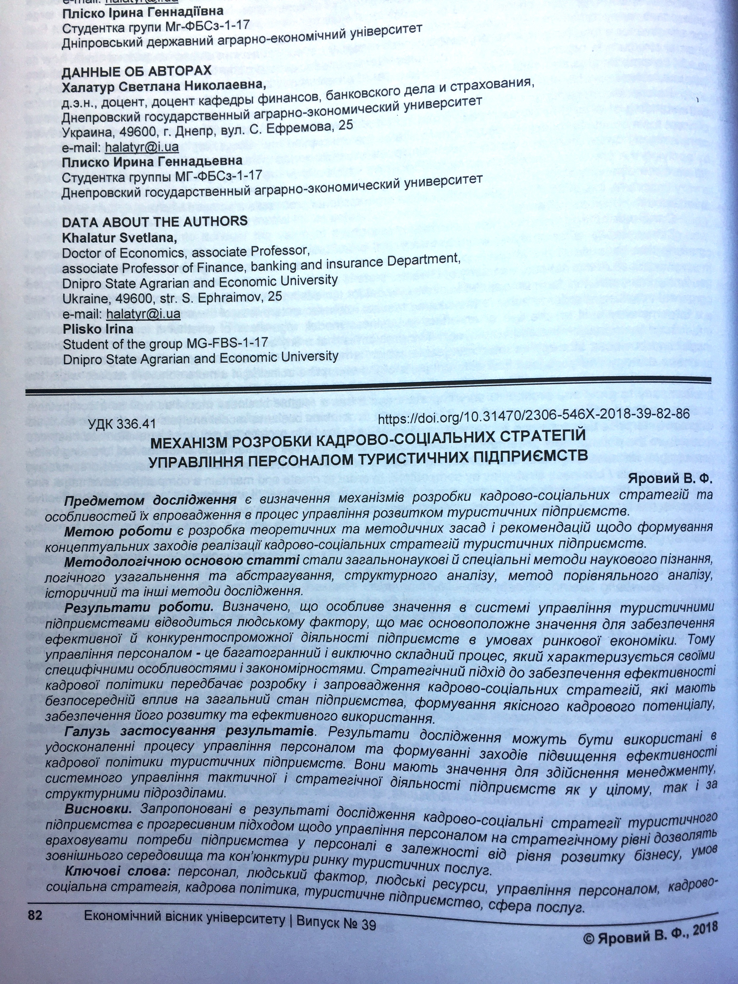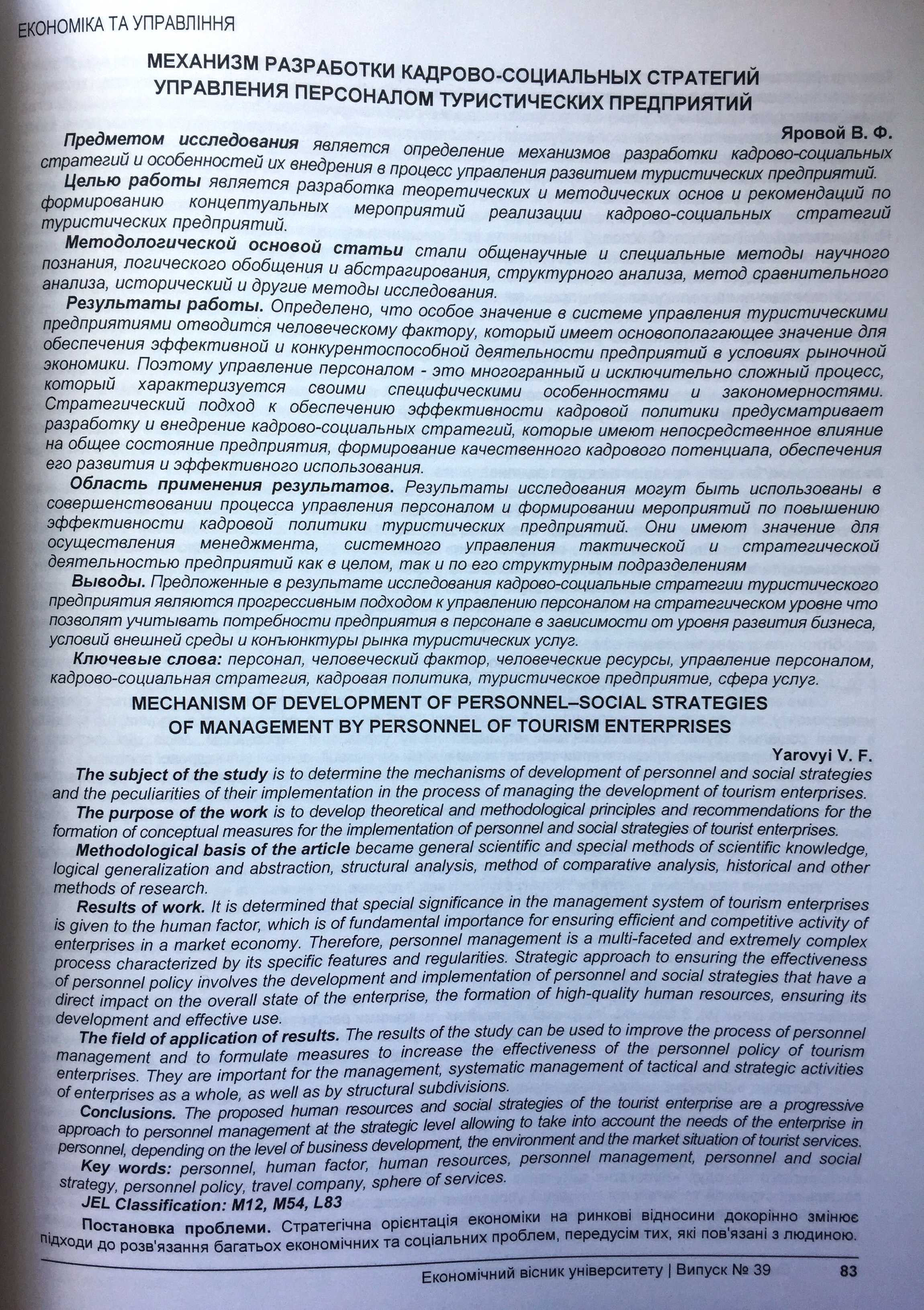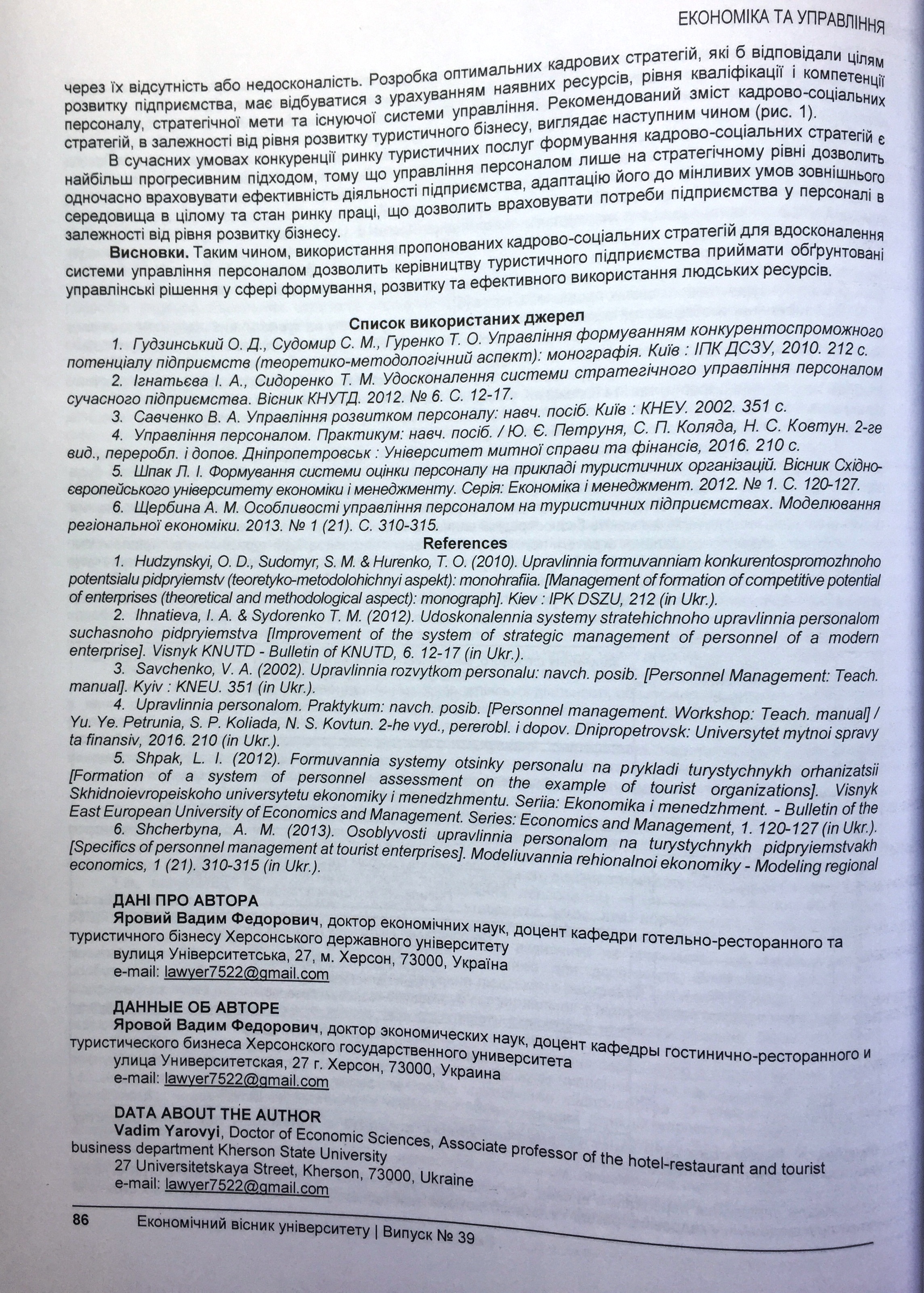 Яровий, В. Ф. Механізм розробки кадрово-соціальних стратегій управління персоналом туристичних підприємств / В. Ф. Яровий // Економічний вісник університету / Переяслав-Хмельницький ДПУ ім. Г. Сковороди. - 2018. - № 39. - С. 82-86.