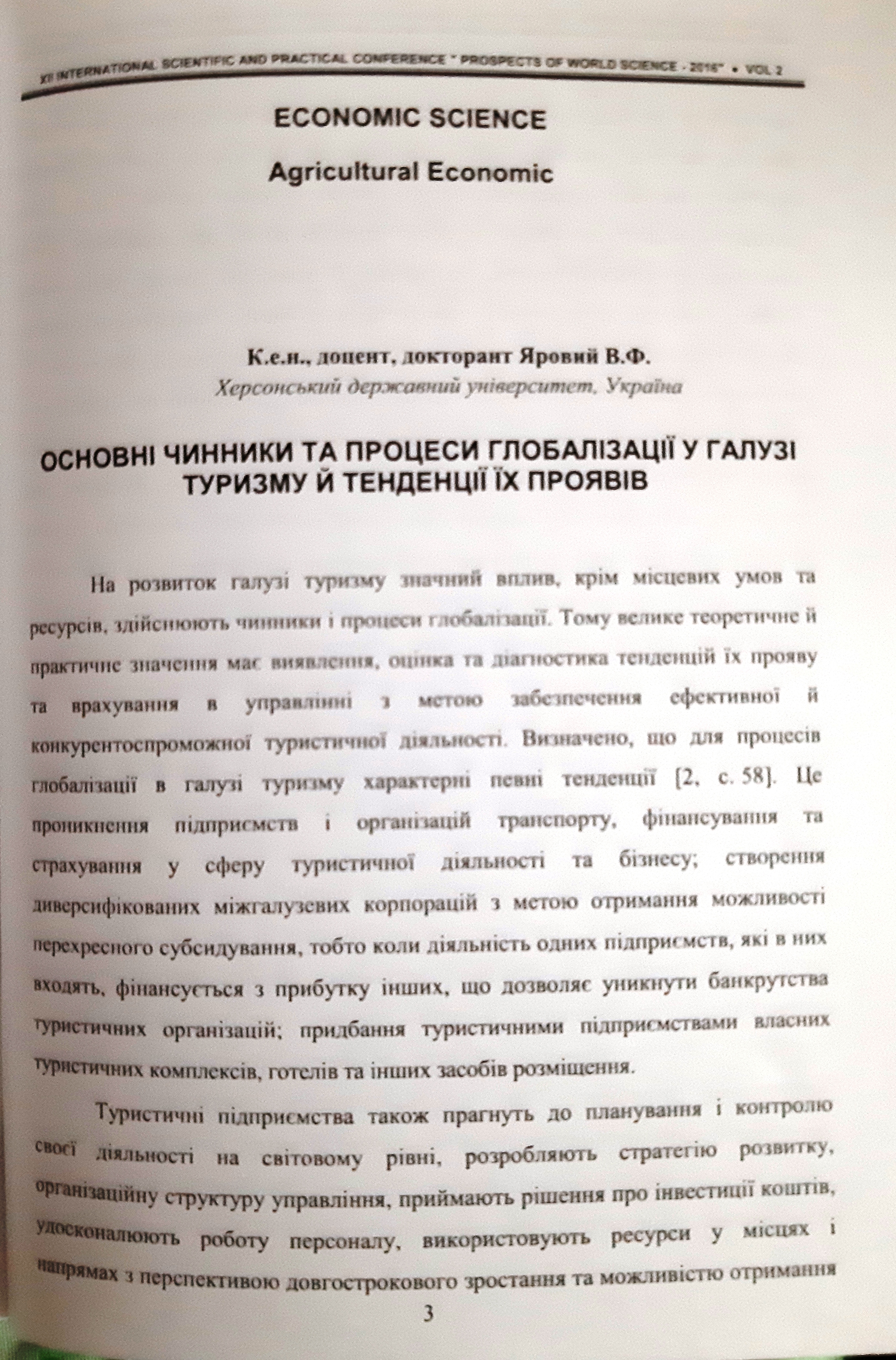 Яровий, В. Ф. Основні чинники та процеси глобалізації у галузі туризму й тенденції їх проявів / В. Ф. Яровий // Prospects of world science – 2016 : Materials of the XII International scientific and practical conference (Sheffield, 30 July – 7 August, 2016). – Volume 2. Sheffield: Science and education LTD. – 2016. – С. 3-6.