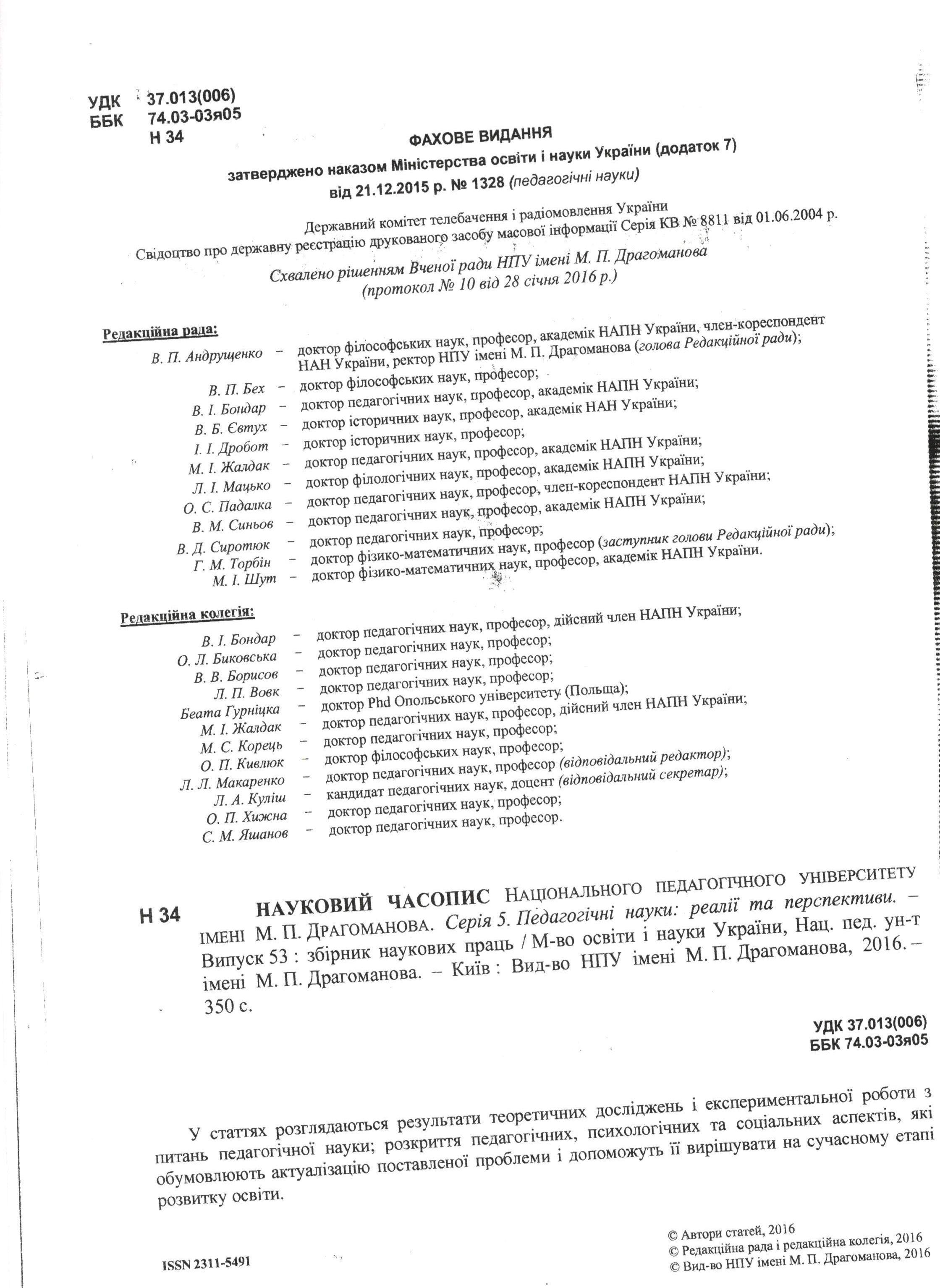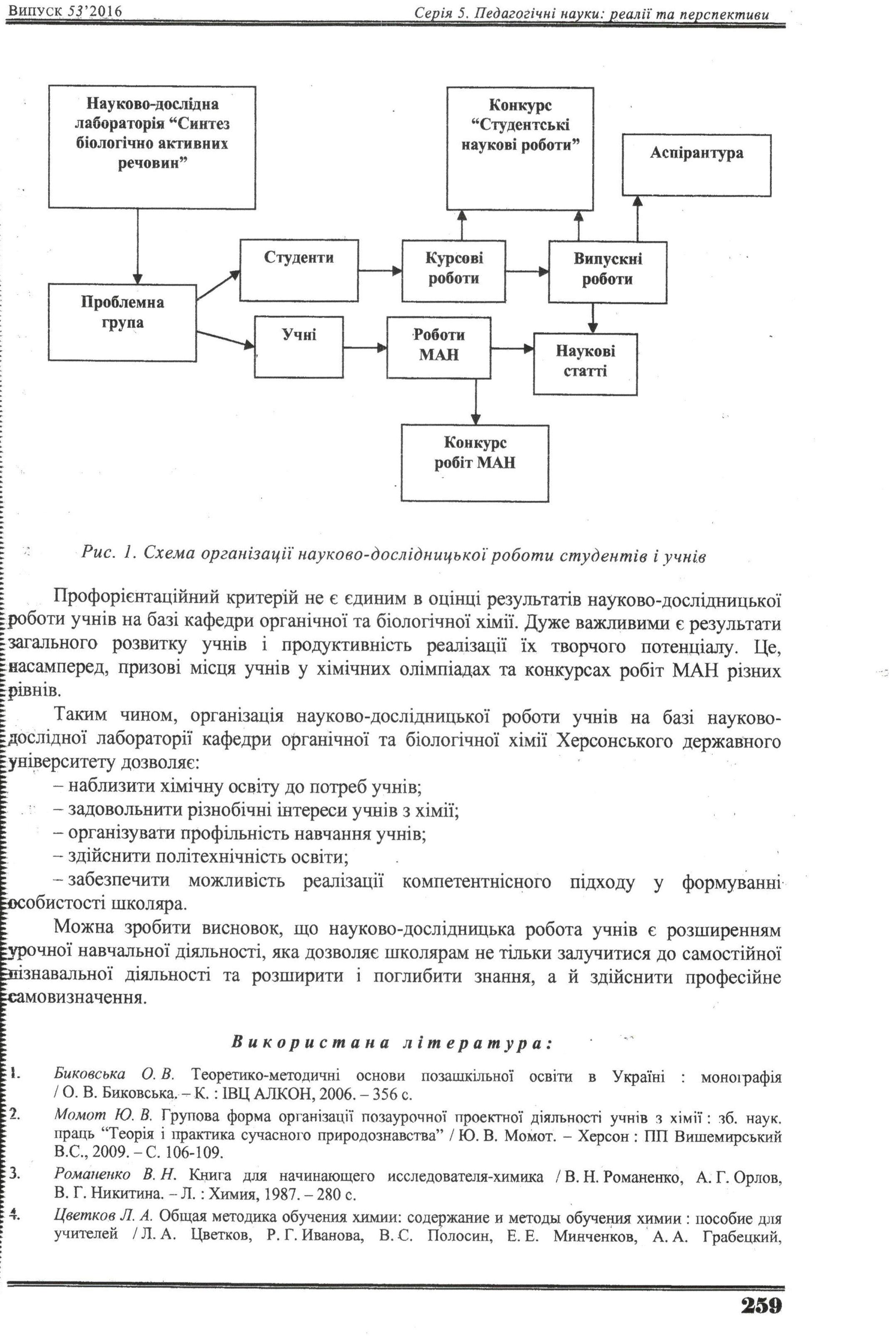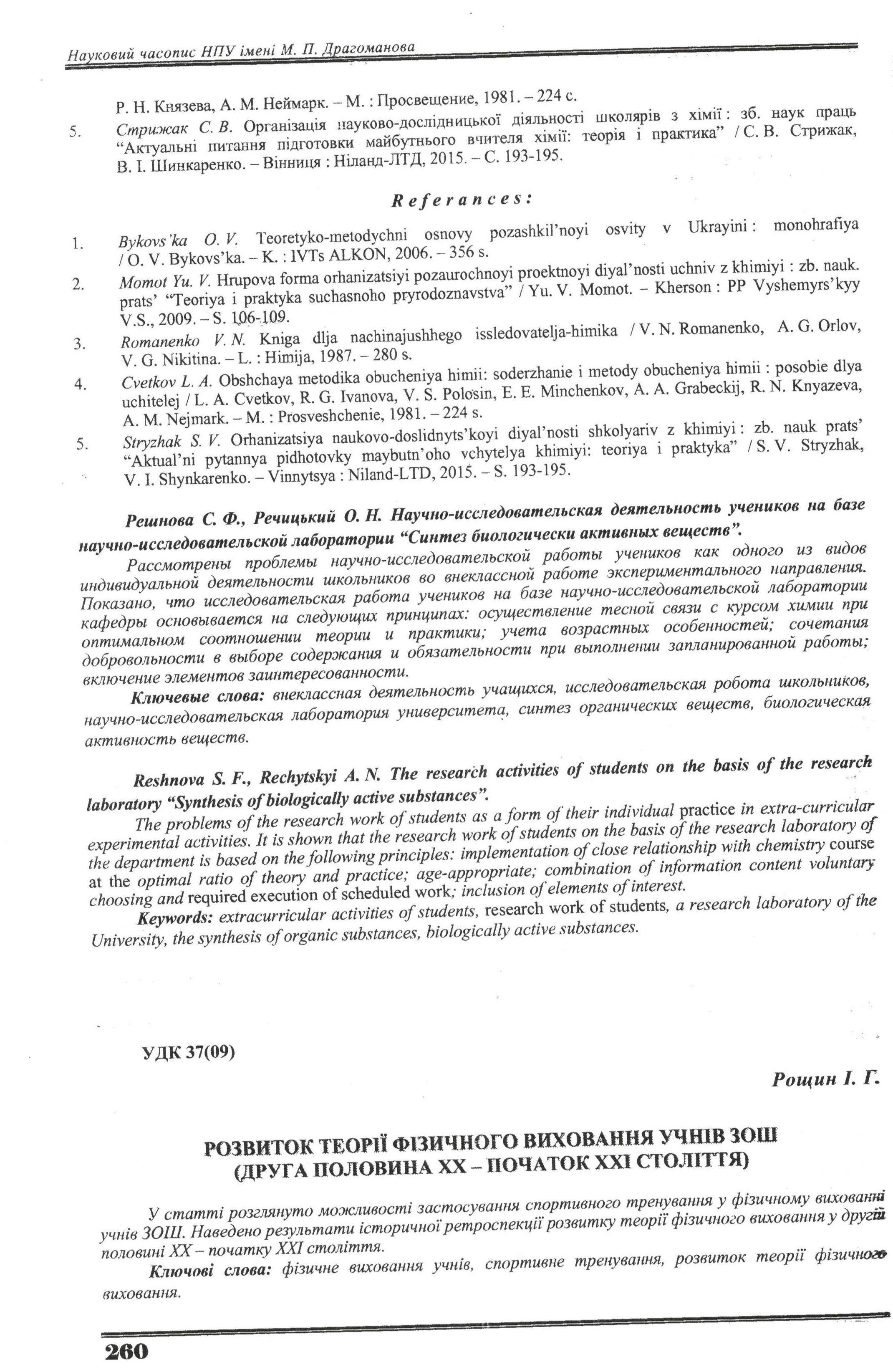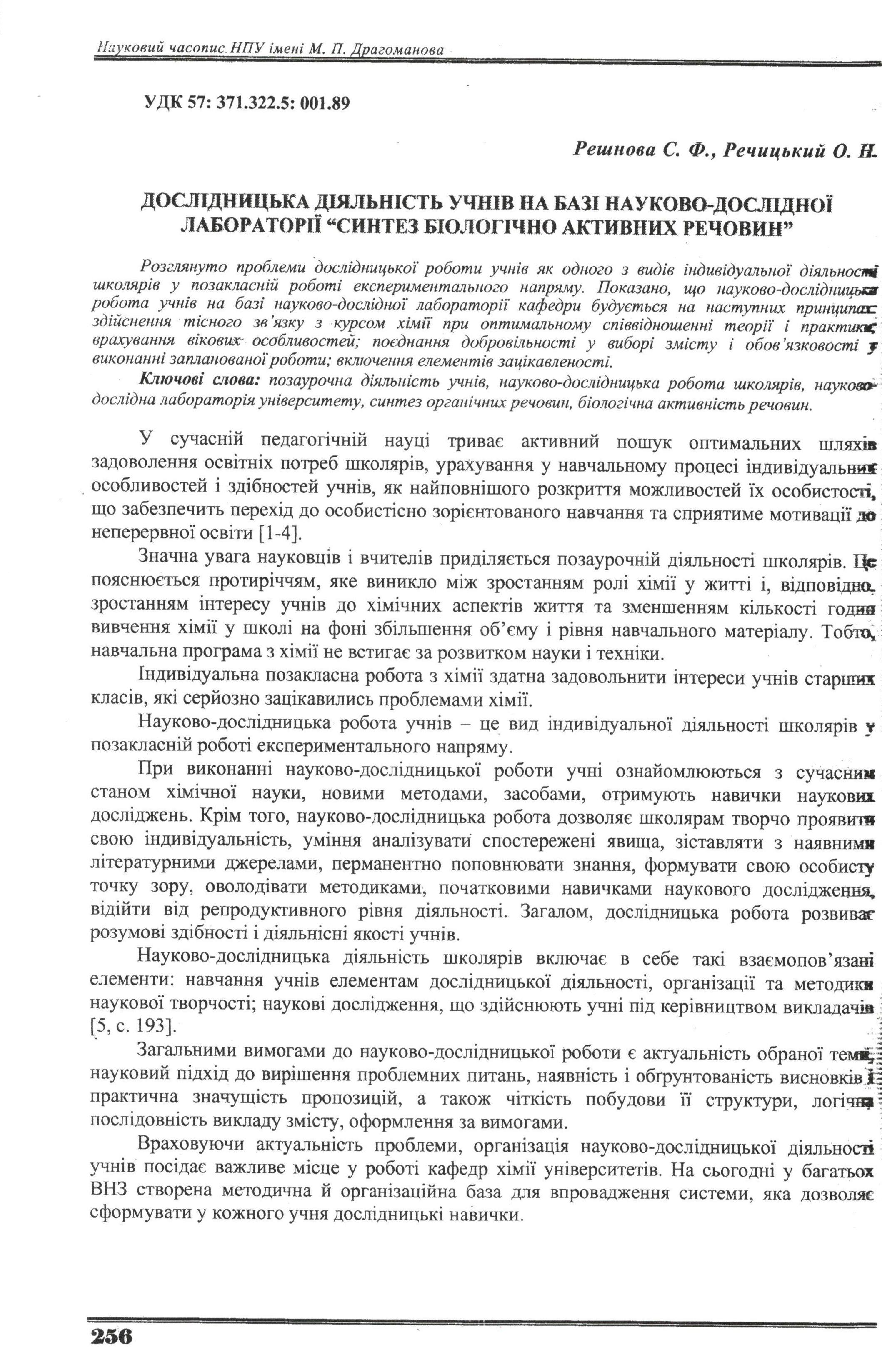 Речицький, О. Н. Дослідницька діяльність учнів на базі науково-дослідної лабораторії “Синтез біологічно активних речовин” / С. Ф. Решнова, О. Н. Речицький // Науковий часопис Нац. пед. ун-ту ім. М. П. Драгоманова. Серія 5, Педагогічні науки : реалії та перспективи. – Київ : КНПУ, 2016. – Вип. 53. - С. 256-260.