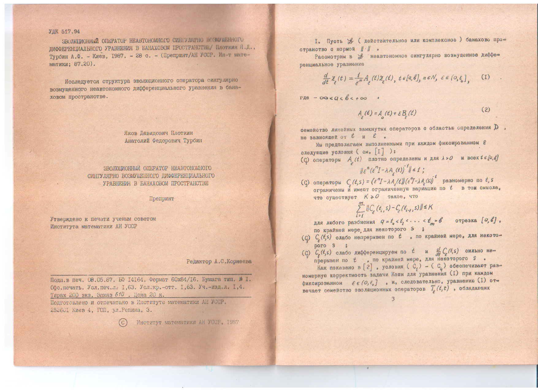 Плоткин, Я. Д. Эволюционный оператор неавтономного сингулярно возмущенного дифференциального уравнения в банаховом пространстве / Я. Д. Плоткин, А. Ф. Турбин. - Киев : Институт математики,1987. - 28 с.