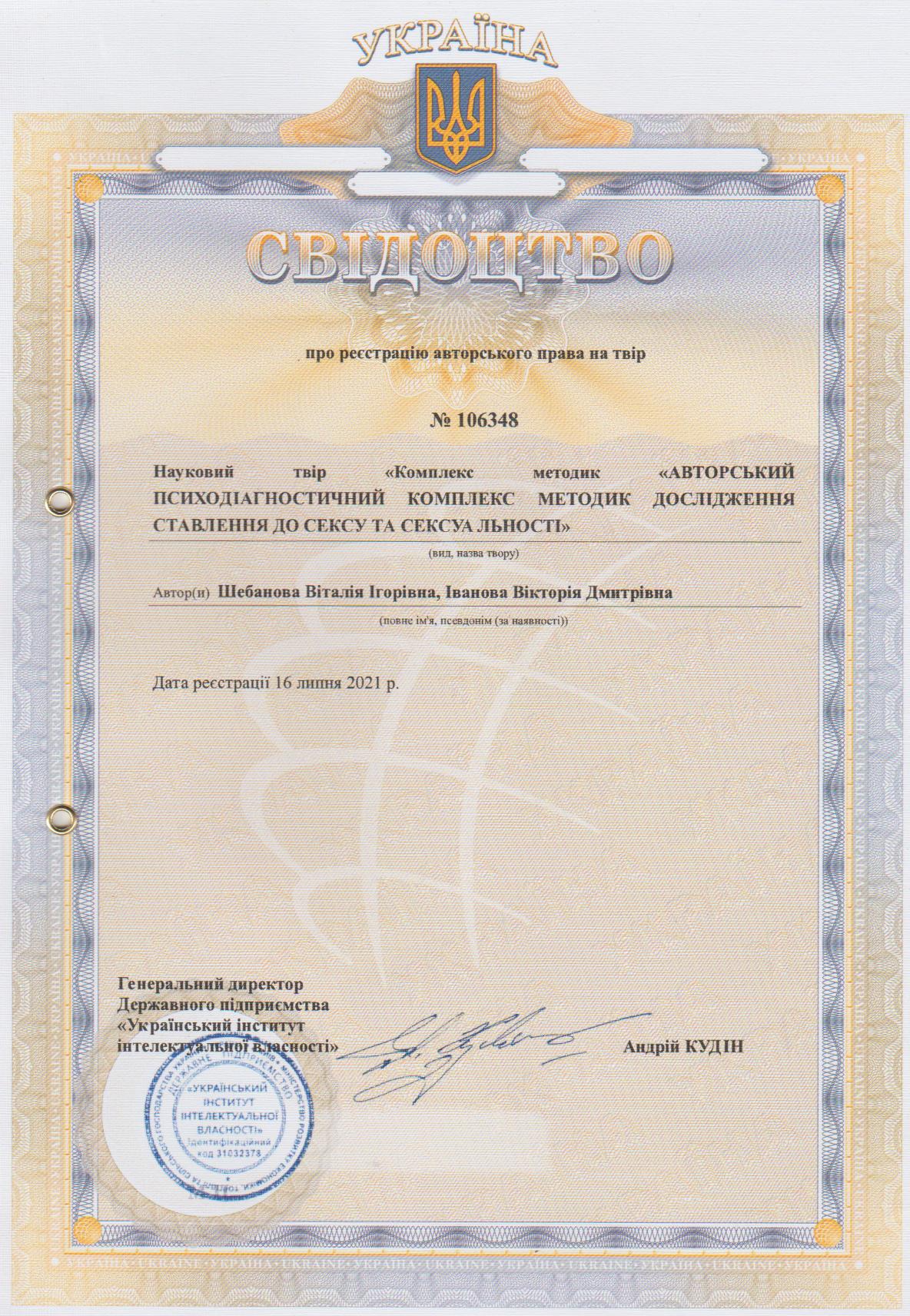 Комплекс методик «Авторський психодіагностичний комплекс методик дослідження ставлення до сексу та сексуальності» : а. с. № 106348 від 16.07.2021 К / В. І. Шебанова, В. Д Іванова ; Державне підприємство «Український інститут інтелектуальної власності»