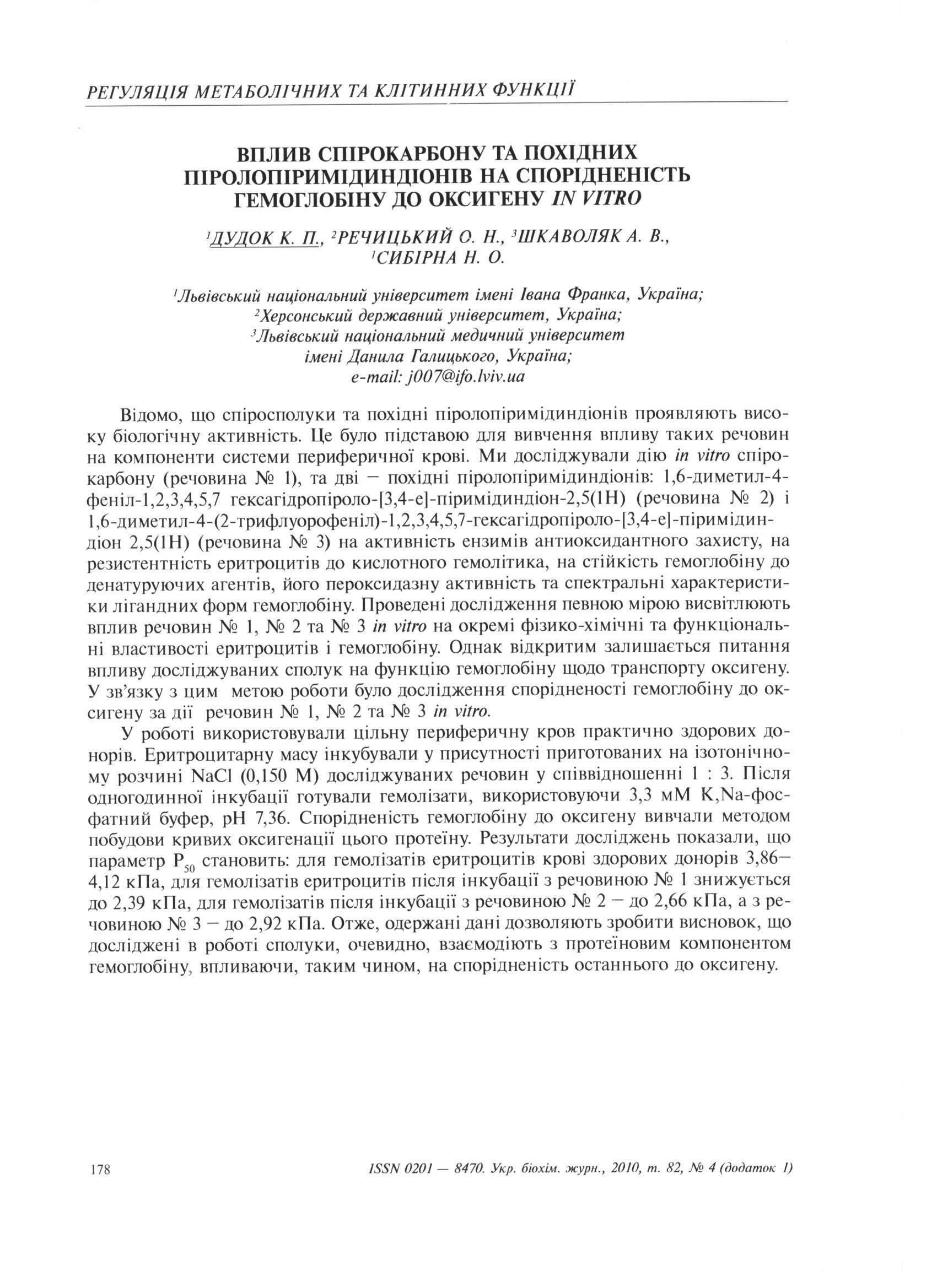 ВПЛИВ СПІРОКАРБОНУ ТА ПОХІДНИХ ПІРОЛОПІРИМІДИНДІОНІВ НА СПОРІДНЕНІСТЬ ГЕМОГЛОБІНУ ДО ОКСИГЕНУ IN VITRO