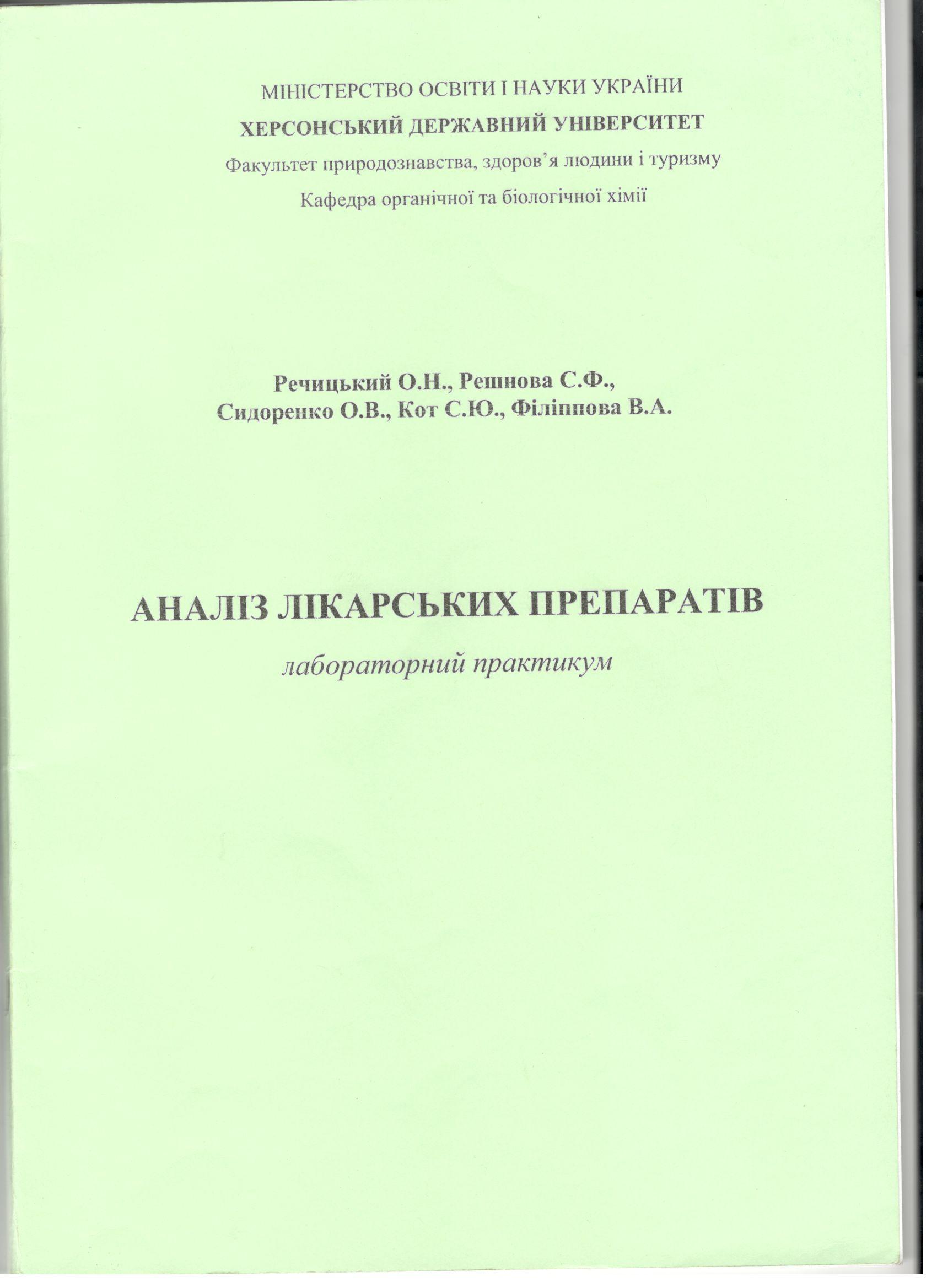 Речицький, О. Н. АНАЛІЗ ЛІКАРСЬКИХ ПРЕПАРАТІВ : лабораторний практикум / О. Н. Речицький, С. Ф. Решнова, О. В. Сидоренко, С. Ю. Кот, В. А. Філіппова. - Херсон : ХДУ, 2017. – 84 с.