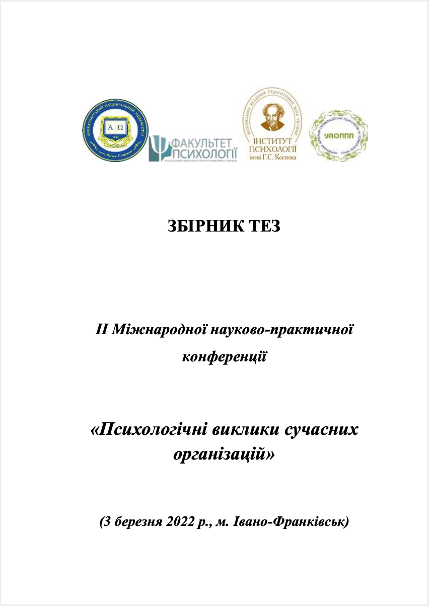 Попович І. С. Аналізування причин виникнення вивченої безпорадності у дітей / А. В. Шевченко, І. С. Попович // Збірник тез ІІ Міжнародної науково-практичної конференції «Психологічні виклики сучасних організацій» (3 березня 2022р., м. Івано- Франківськ) / За наук. ред. проф. Л. С. Пілецької, проф. І. М. Гояна, проф. І. А. Гуляс, доц. О. М. Чуйко. м. Івано-Франківськ, 2022. С. 308-311.