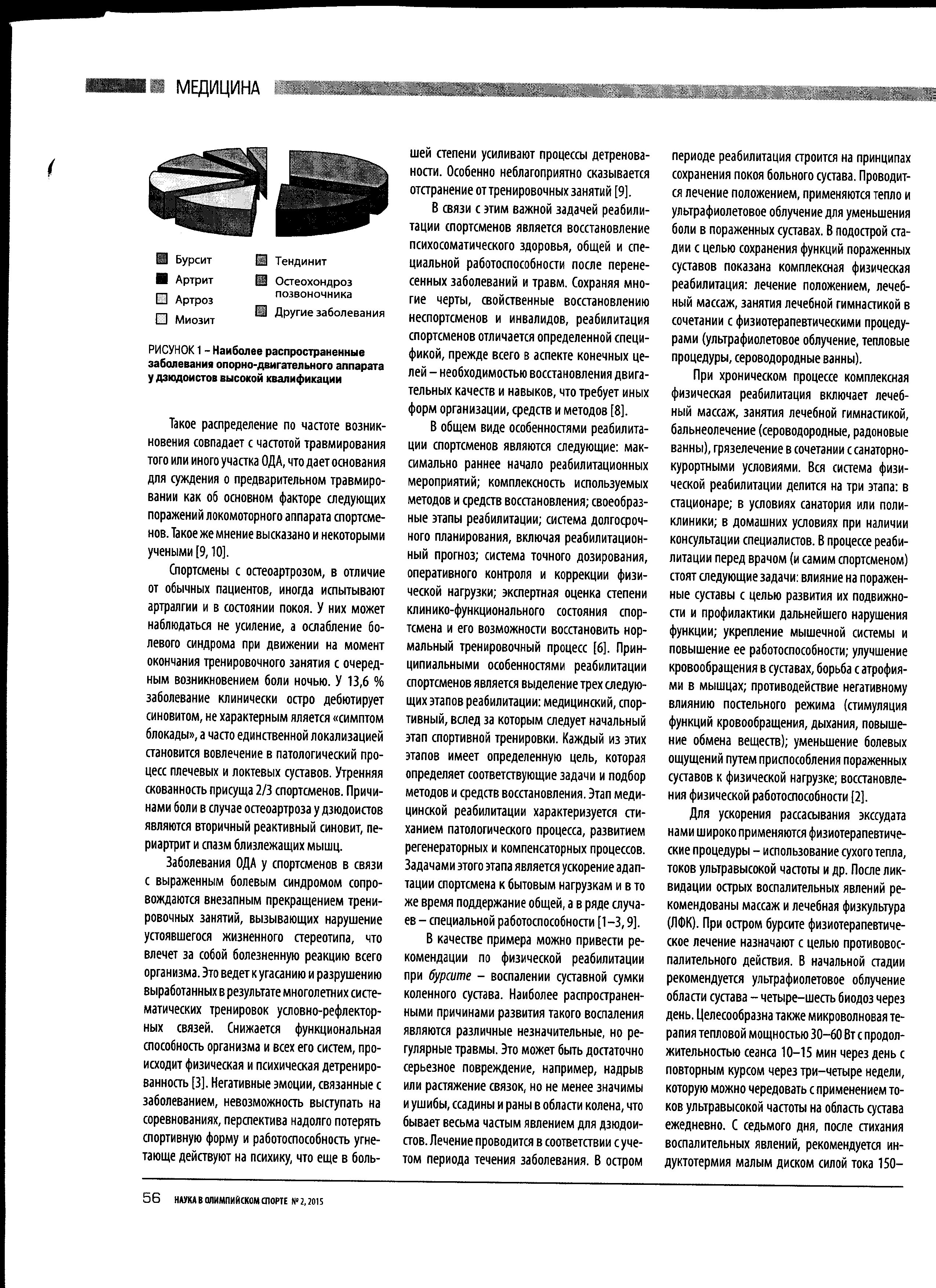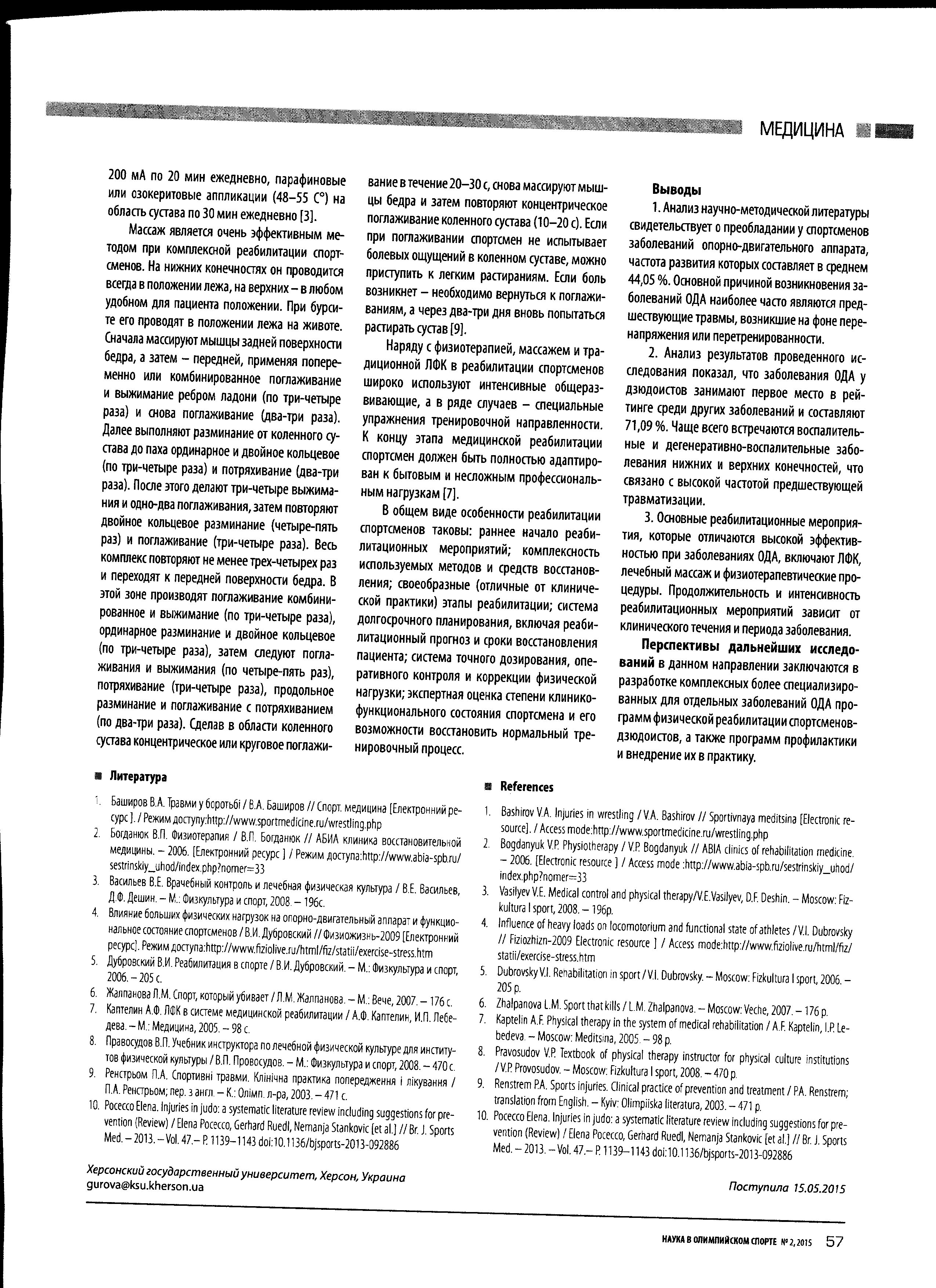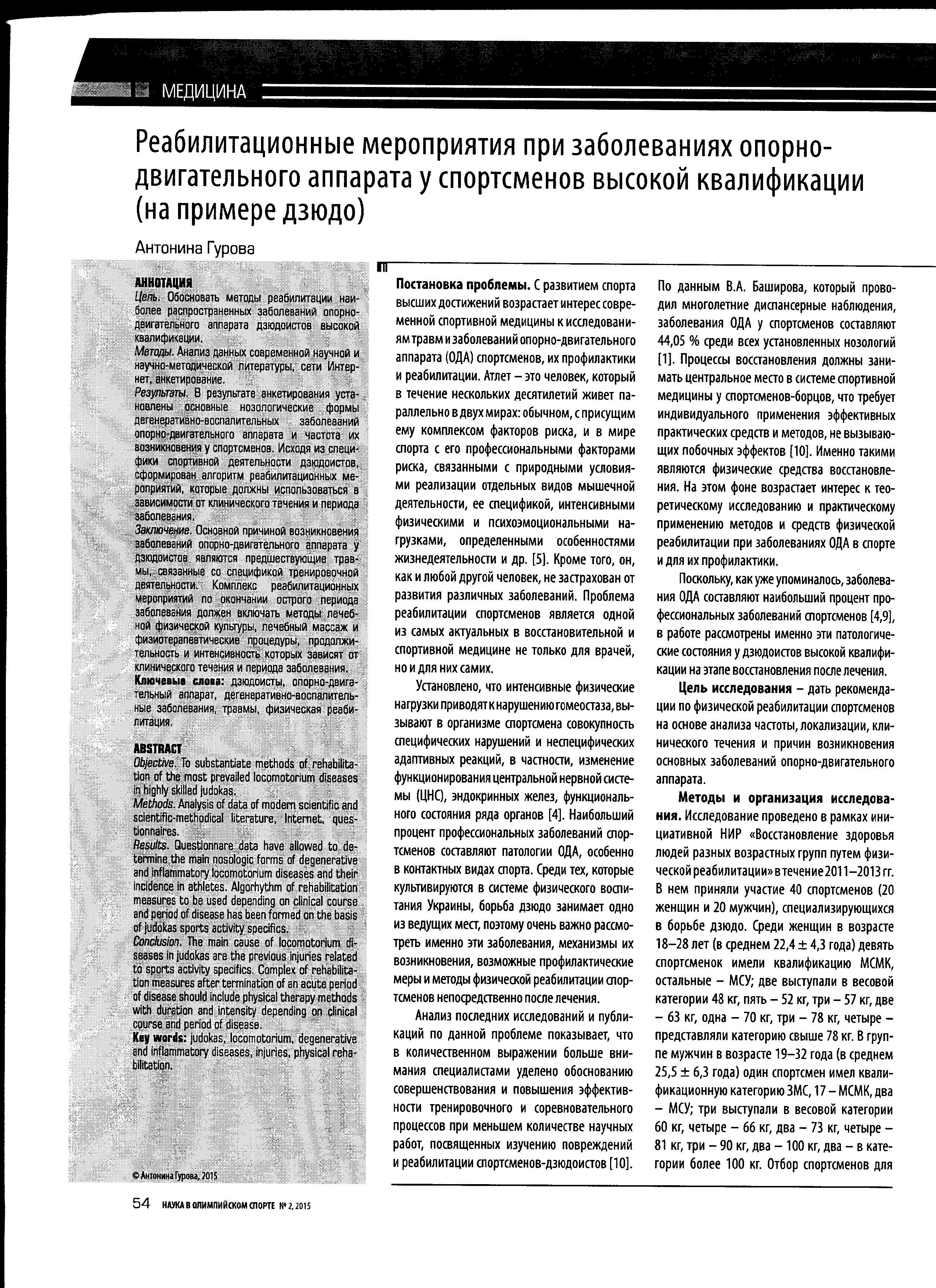 Гурова, А. Реабилитационные мероприятия при заболеваниях опорно-двигательного аппарата у спортсменов высокой квалификации (на примере дзюдо) / А. Гурова // Наука в олимпийском спорте.- 2015 р. - № 2. – С. 54-57.