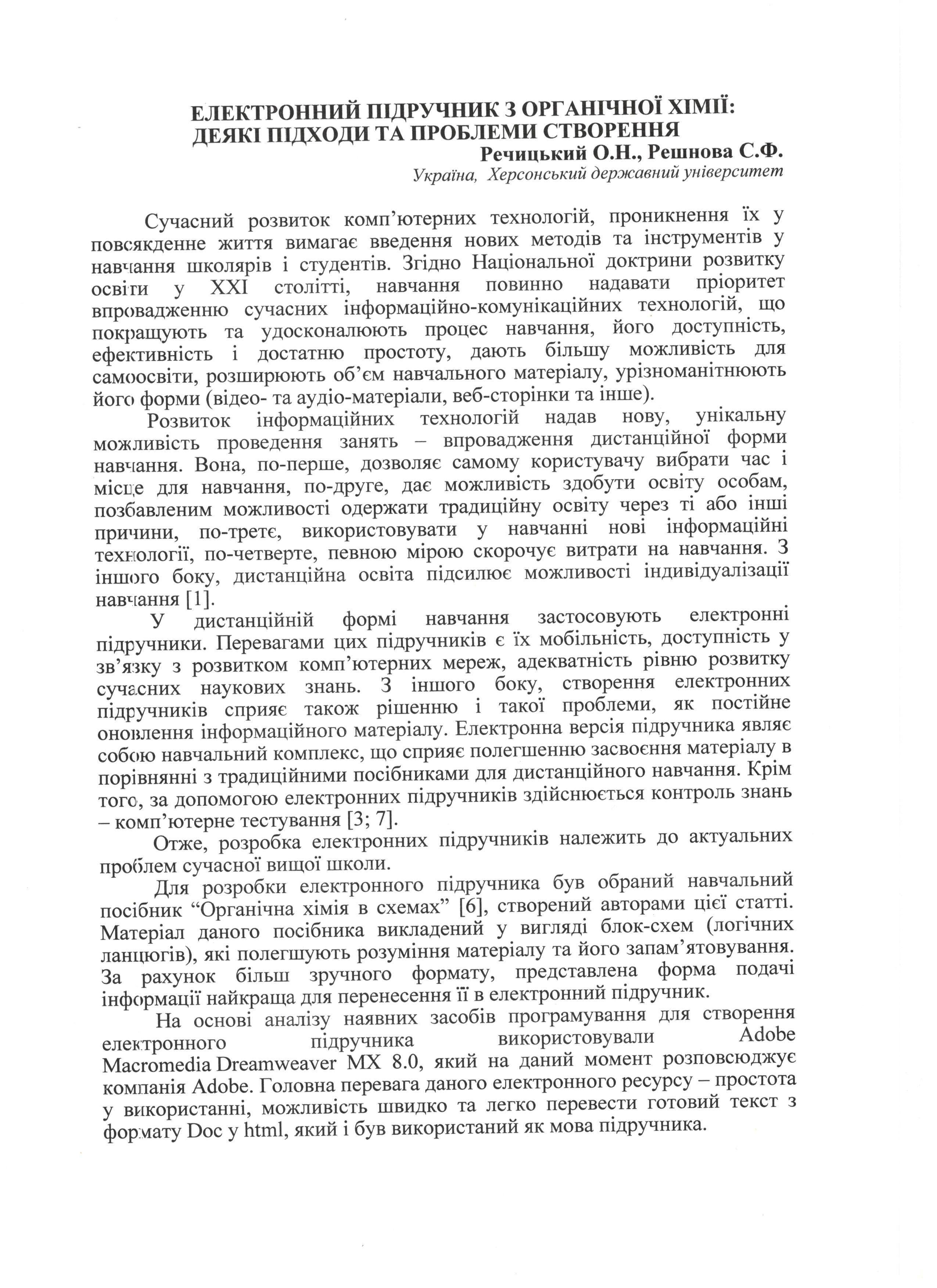 Речицький, О. Н. Електронний підручник з органічної хімії і деякі підходи проблеми його створення / О. Н. Речицький, С. Ф. Решнова // Хімічна наука та освіта : перспективи розвитку : матер. інтернет конф. (м. Полтава, 22-26 квітня 2013 р.) / Полтавський нац. пед. ун-т ім. В. Г. Короленка ; ред. : проф. М. Гриньова та ін. – Полтава : ПНПУ, 2013. – С. 185-188.