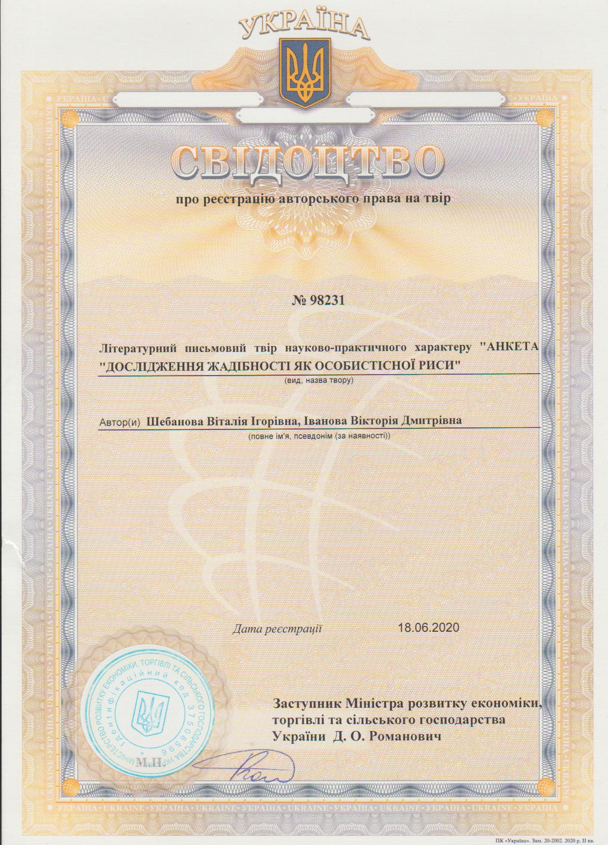 Дослідження жадібності як особистісної риси : а. с. № 98231 від 18.06.2020 К / В. І. Шебанова, В. Д. Іванова ; М-во розвитку економіки, торгівлі та сільського господарства України.