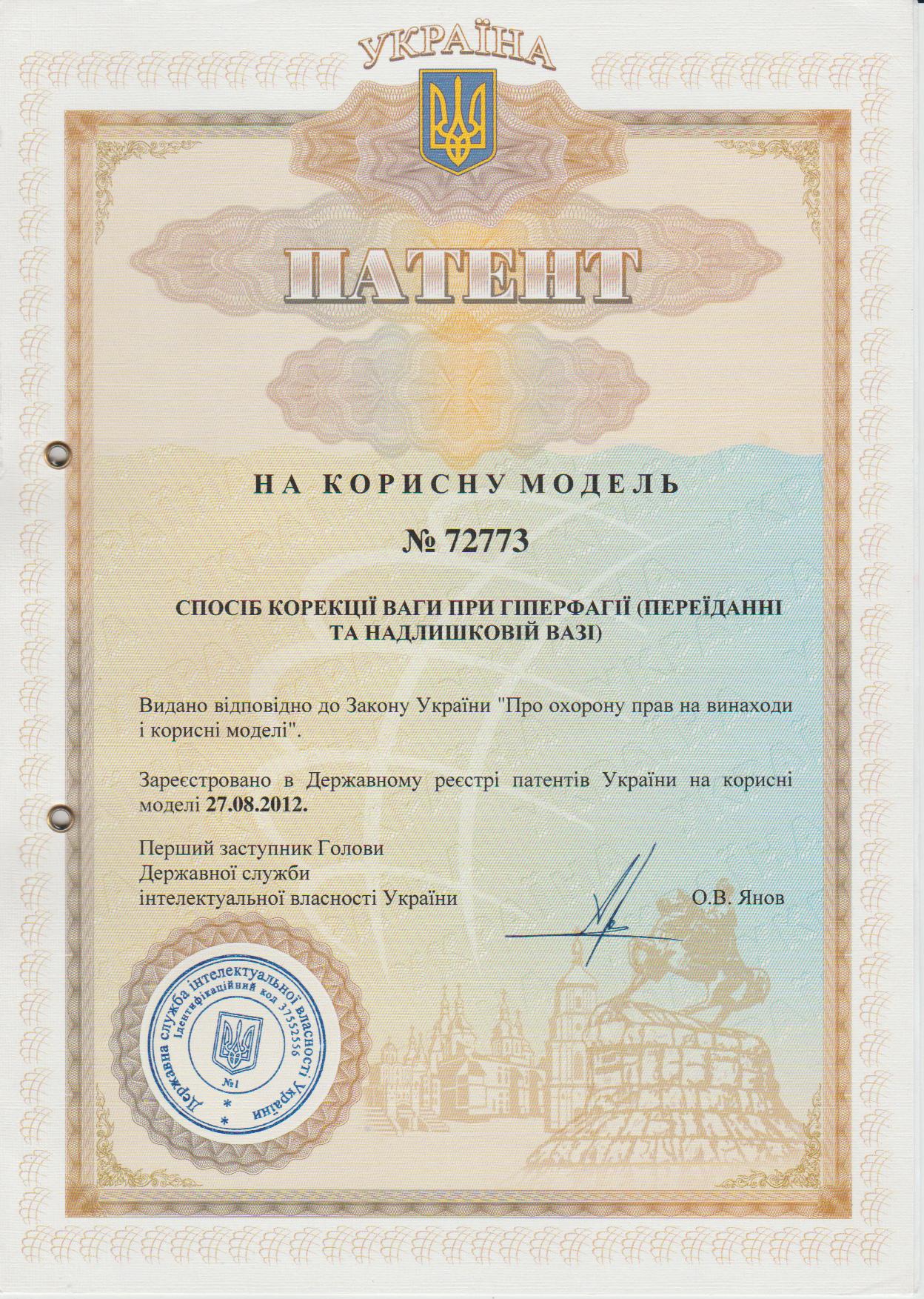 Пат. 72773 Україна. Спосіб корекції ваги при гіперфагії (переїданні та надлишкової вазі) / В. І. Шебанова; Державний департамент інтелектуальної власності від 27.08.2012