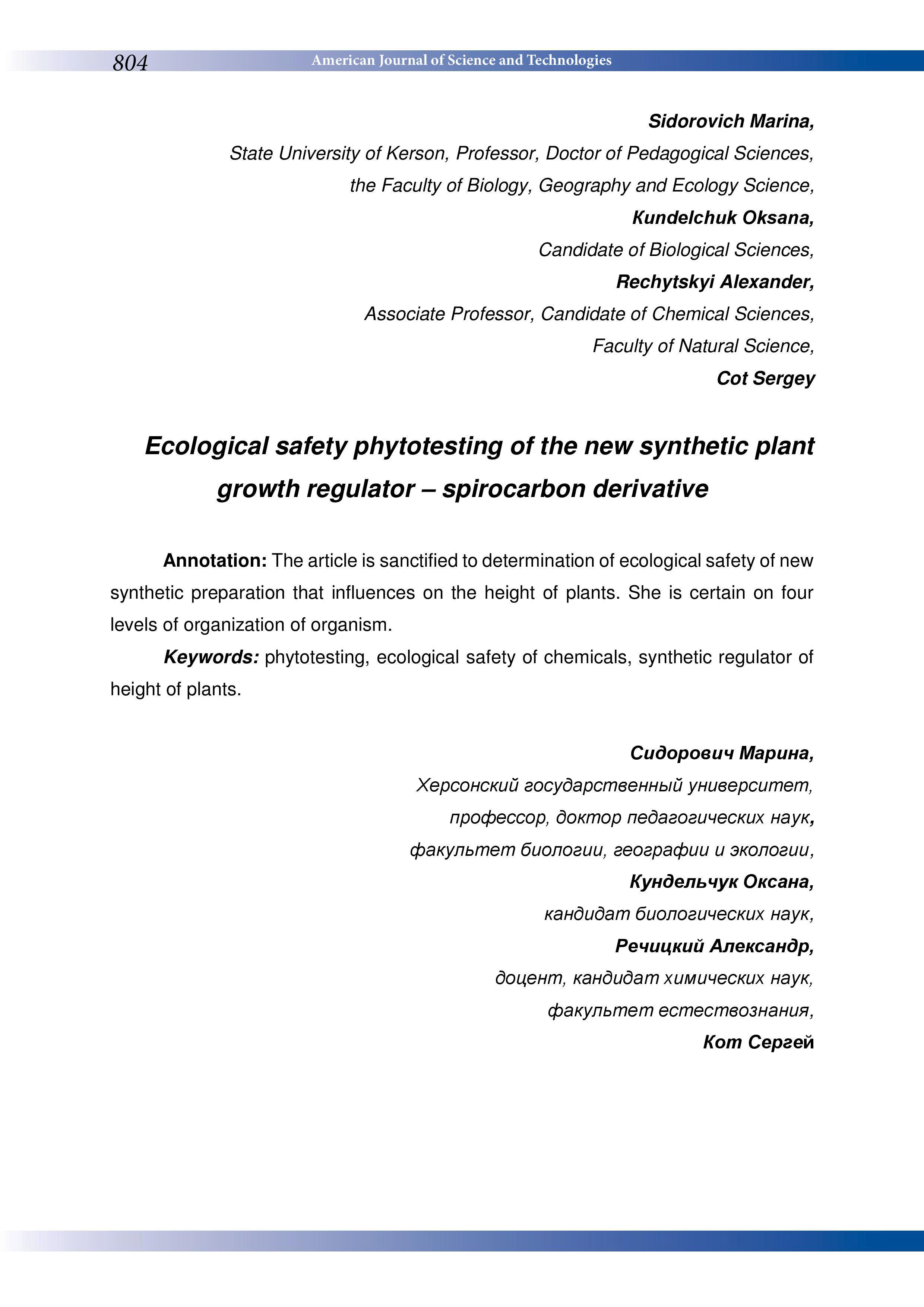 Rechytskyi, O. Ecological safety phytotesting of the new synthetic plant growth – spirocarbon derivative / M. Sidorovich, O. Kundelchuk, O. Rechytskyi, S. Cot // American Journal of Science and Technologies. – 2015 (Juli-December). – № 2 (20). - P. 805-815.