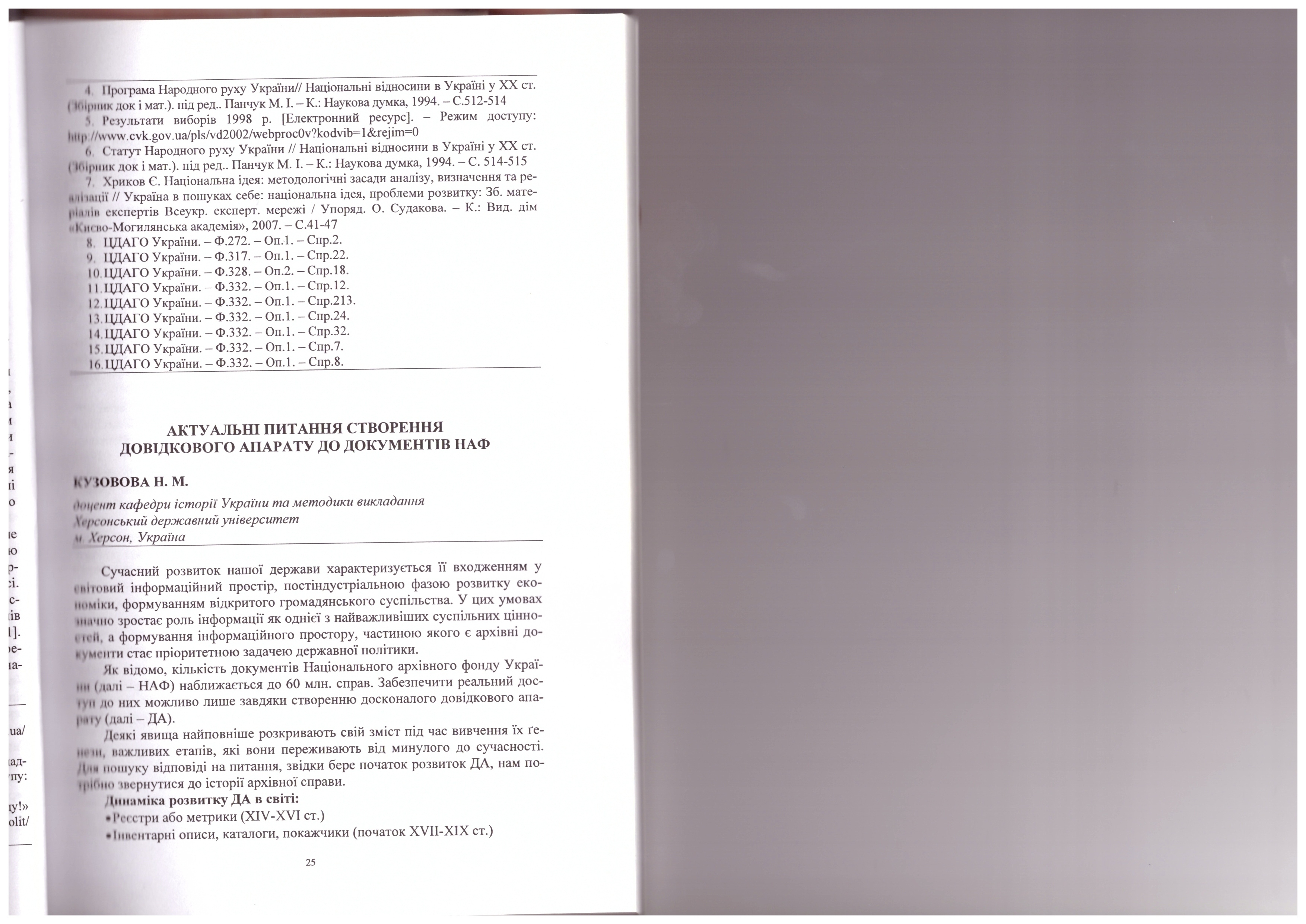 Кузовова, Н. М. Актуальні питання створення довідкового апарату до документів НАФ / Н. М. Кузовова // Пріоритетні напрямки розвитку суспільних наук у ХХІ столітті : матер. міжнар. наук.-практ. конф. (м. Херсон, 21-22 лютого 2014 р.). - Херсон : Вид. дім "Гельветика", 2014. - С. 25-29.