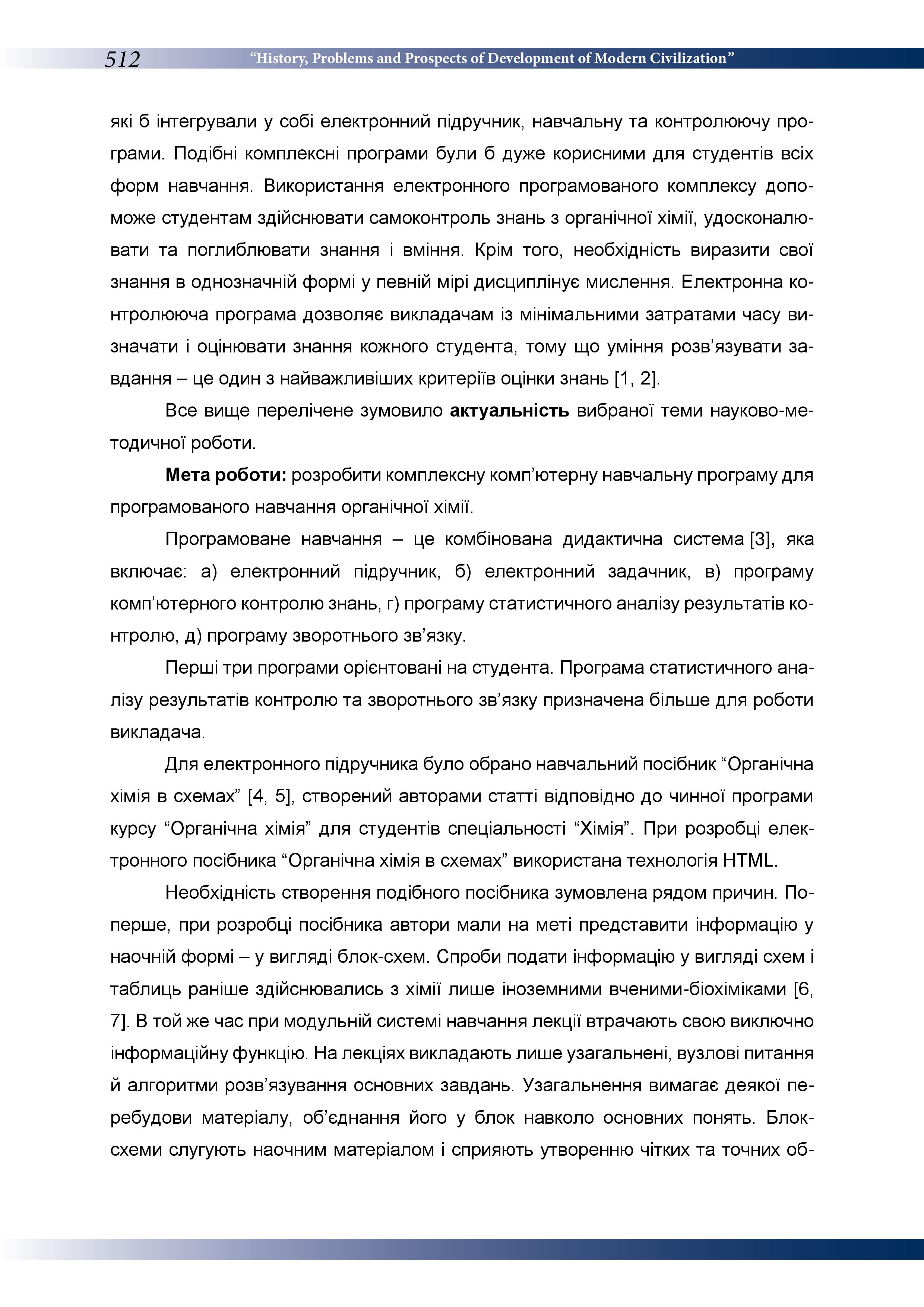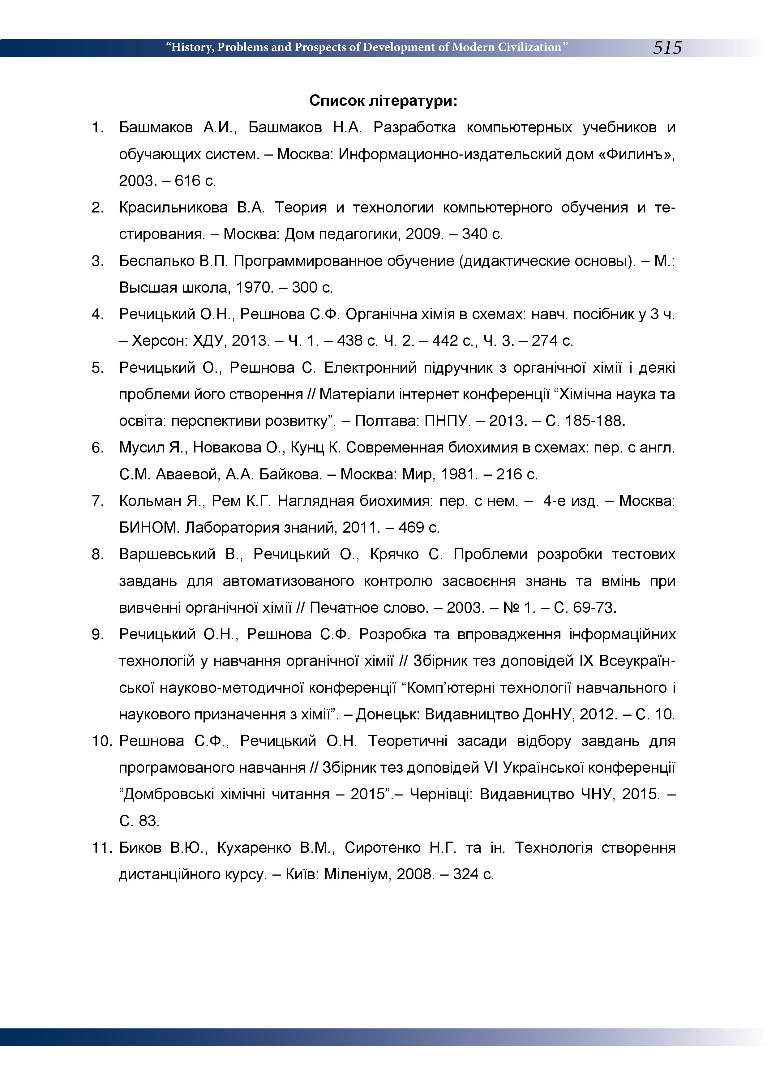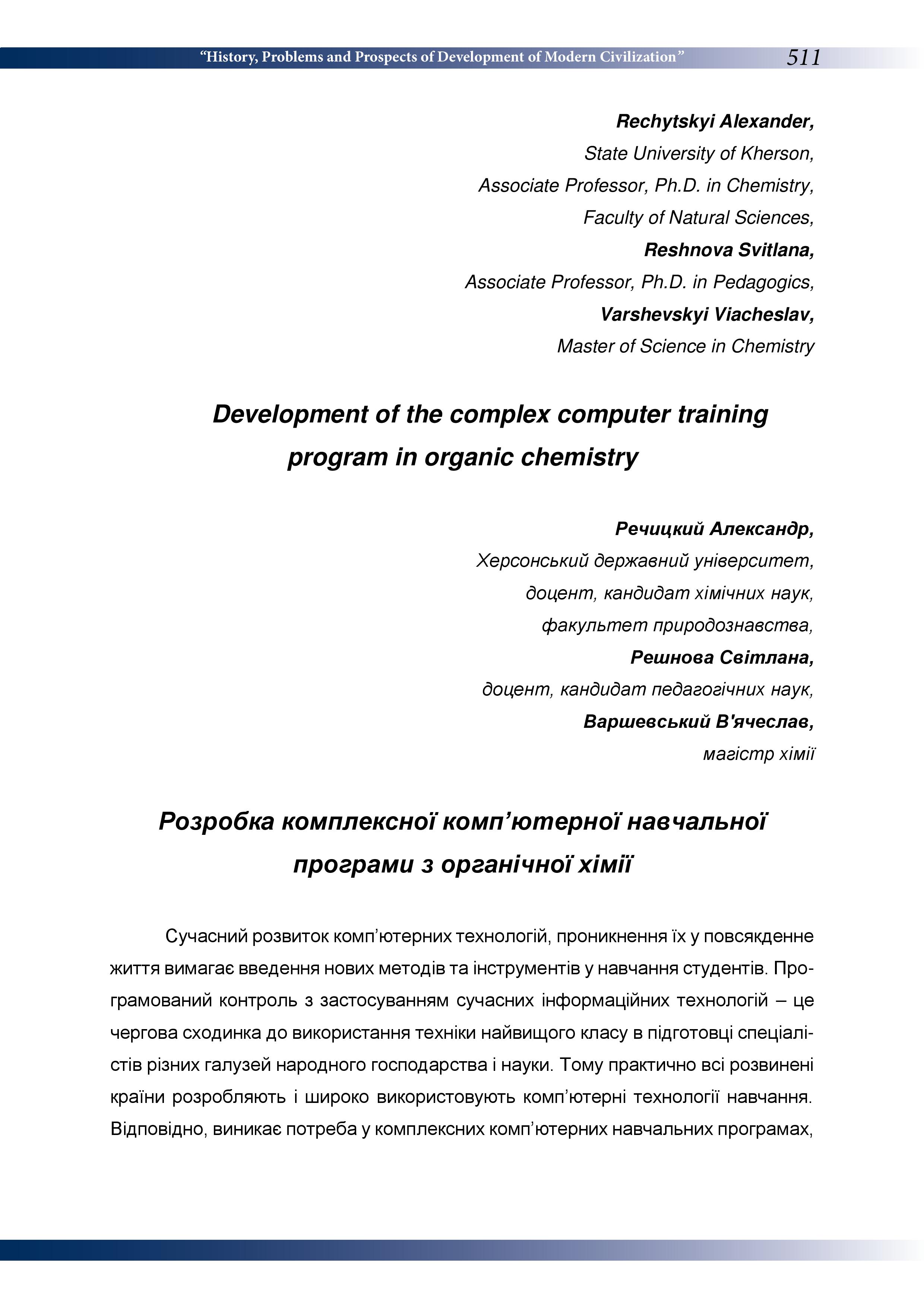 Rechytskyi, O. Development of the complex computer training program in organic chemistry / O. Rechytskyi, S. Reshnova, V. Varshevskyi // The XVII International Academic Congress "History, Problems and Prospects of Development of Modern Civilization" (Tokyo, Japan, 25-27 January 2016). – Papers and Commentaries.– Tokyo : Tokyo University Press. – V. 2. – P. 511-515.